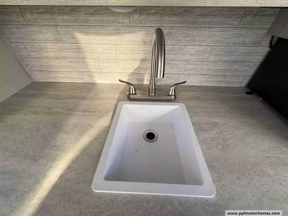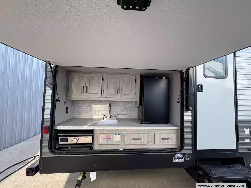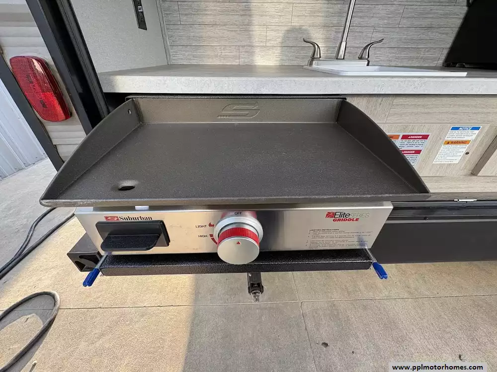 Outside kitchen has a flatstone griddle, fridge, sink and storage