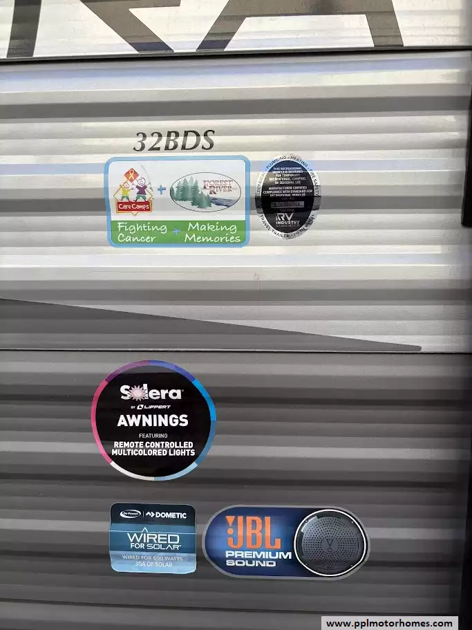 This 2024 Aurora 30BDS has an Electric Tongue Jack, 2 Slide-outs, 2 Ducted Air Conditioners, Double Door Ge Refrigerator, Automatic Main Awning And Window/Slide Awnings, Outside Speakers, TV, Outdoor Kitchen, Outside Shower, Fireplace, Microwave, 3 Burner Range, Oven