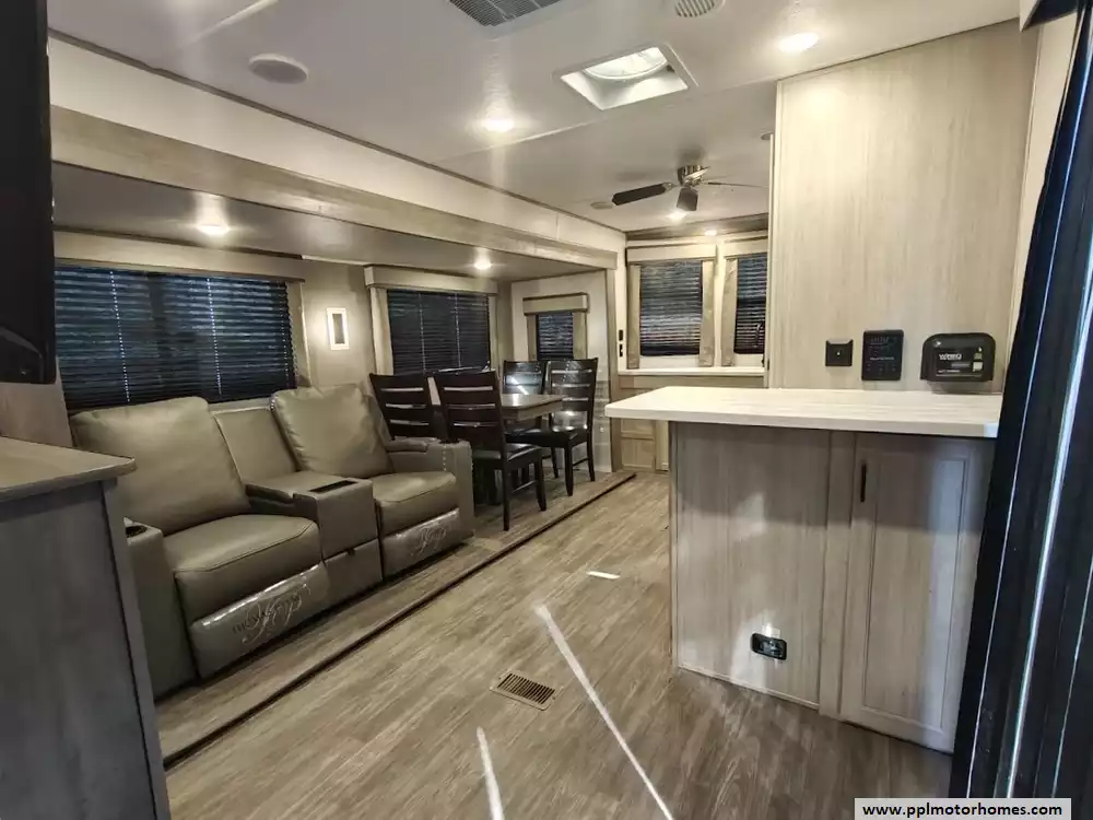 The 2024 Forest River Aurora 39MBTS is a spacious destination trailer designed for seasonal living and extended stays. Features a unique front kitchen layout, dual entry doors (including a sliding patio door), and two bedrooms, a master bedroom with ceiling fan and a mid-bunk room or loft area for extra sleeping space. The living area is designed as a spacious open floorplan, centrally-located gathering spot that emphasizes comfort and a residential feel. A large patio door serves as the main entry point and provides abundant natural light and exterior views. The living space features a central entertainment hub with a TV, JBL sound and an inviting electric fireplace. The kitchen features a 2 door Insignia refridgerator, 3-burner range, microwave and ample counter space for preparing meals. Additionally the kitchen has Thermofoil seamless countertops, which resist moisture and are easy to clean, a breakfast bar, providing extra dining or prep spacem, ample storage with soffit lighting and a silverware drawer. A large electric awning extends the outdoor living space. A convenient hands-free outside shower is available for rinsing off gear or pets.