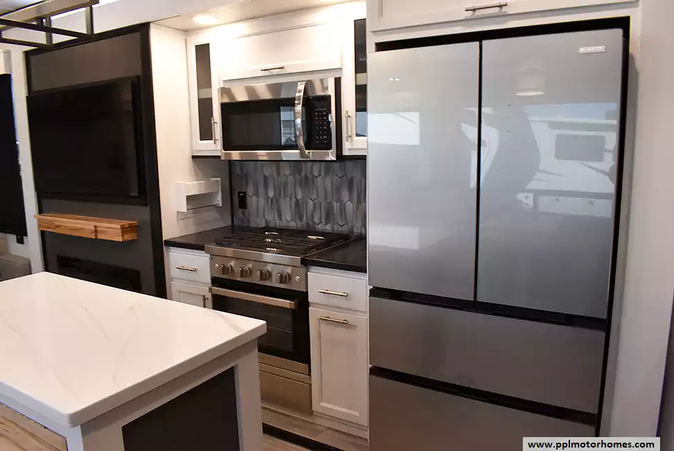 This 2024 Cottage 40CFK2 has a 3 Slide-outs, 2 Ducted Air Conditioners, Residential Furrion Refrigerator, Automatic Main Awning, Washer/Dryer, Dishwasher, Heated Tanks, Satellite Receiver, 2 TVs, Fireplace, Microwave, 3 Burner Range, Oven