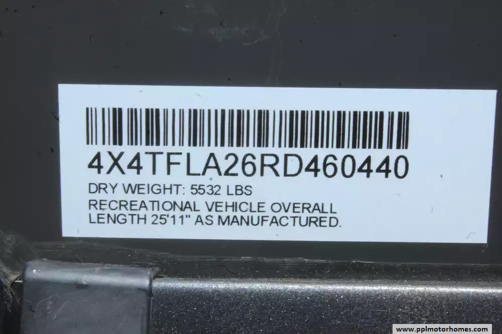Specs: Length: 25.11 ft., Width: 8ft., Height: 10.11 ft., Payload Capacity: 1,434 lbs., Total Fresh Water Tank Capacity: 54 gal., Total Gray Water Tank Capacity: 30 gal., Total Black Water Tank Capacity: 30 gal.
