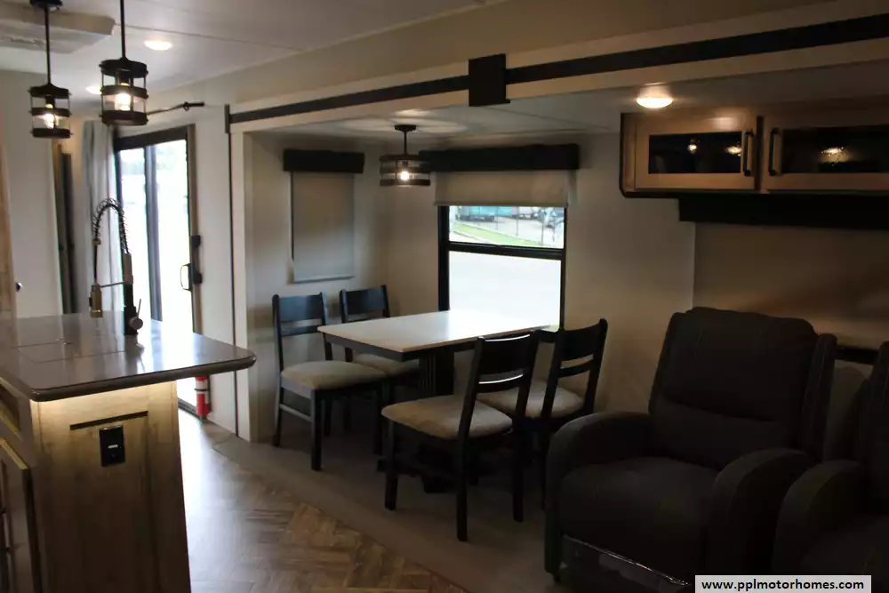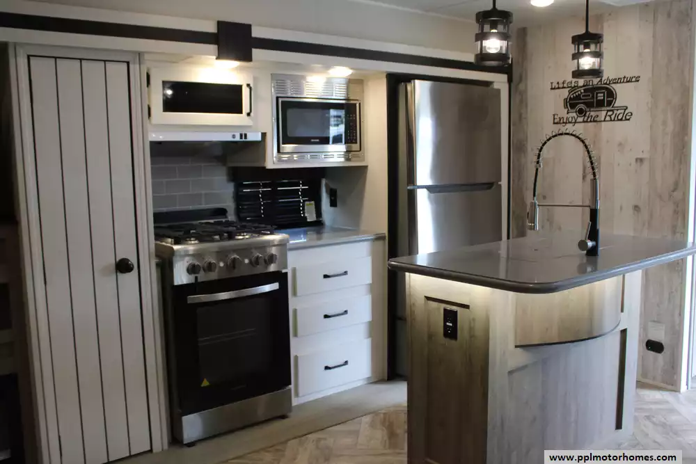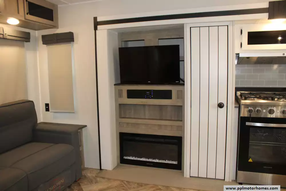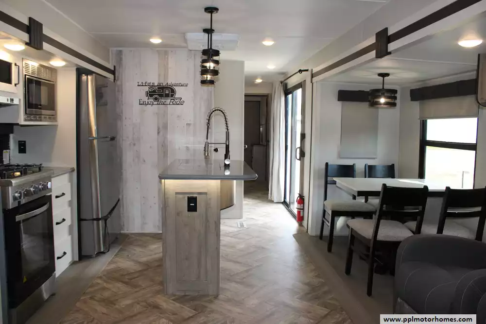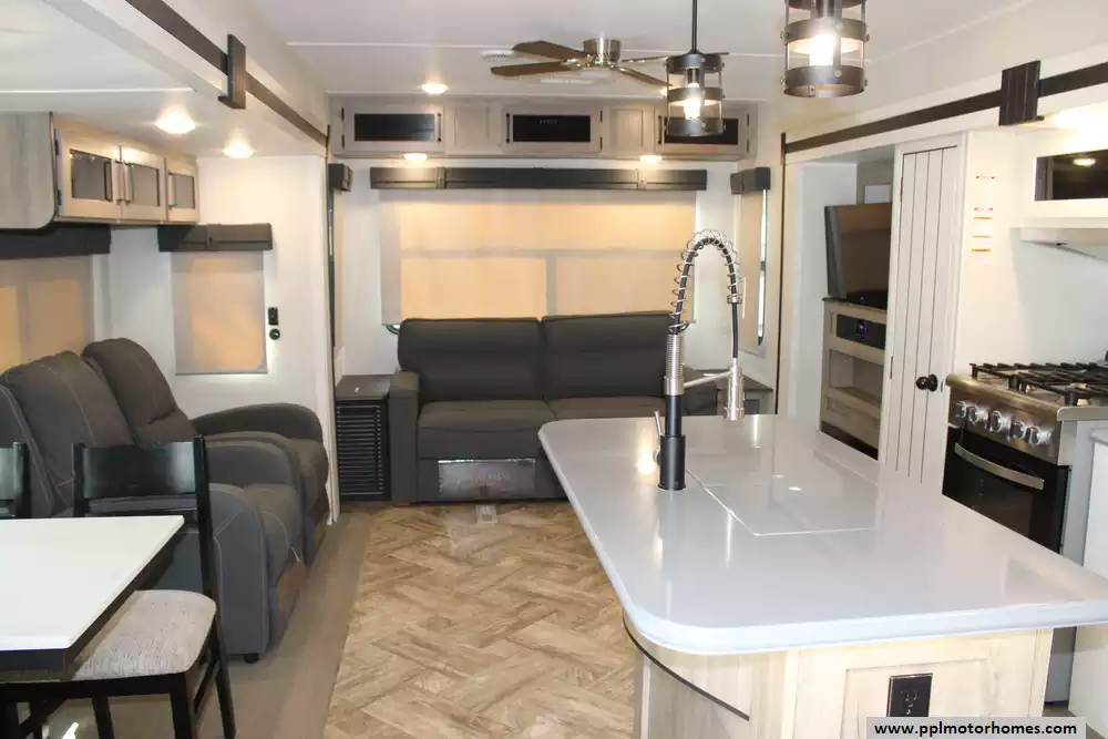 This 2024 Puma 38RLB is a spacious, family/evening focused destination trailer with a dual-entry layout, ample bunk sleeping, luxurious living areas, and solid kitchen functionality. Amenities Include...Electric Tongue Jack, 4 Slide-outs, 2 Ducted Air Conditioners, Double Door 110v/12v Insignia Refrigerator, In-Fridge Ice Maker, Automatic Main Awning, Washer/Dryer, Outside Speakers, TV, Outside Shower, Fireplace, Microwave, 4 Burner Range, and Oven.