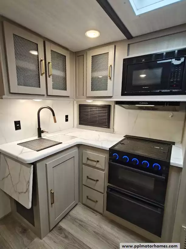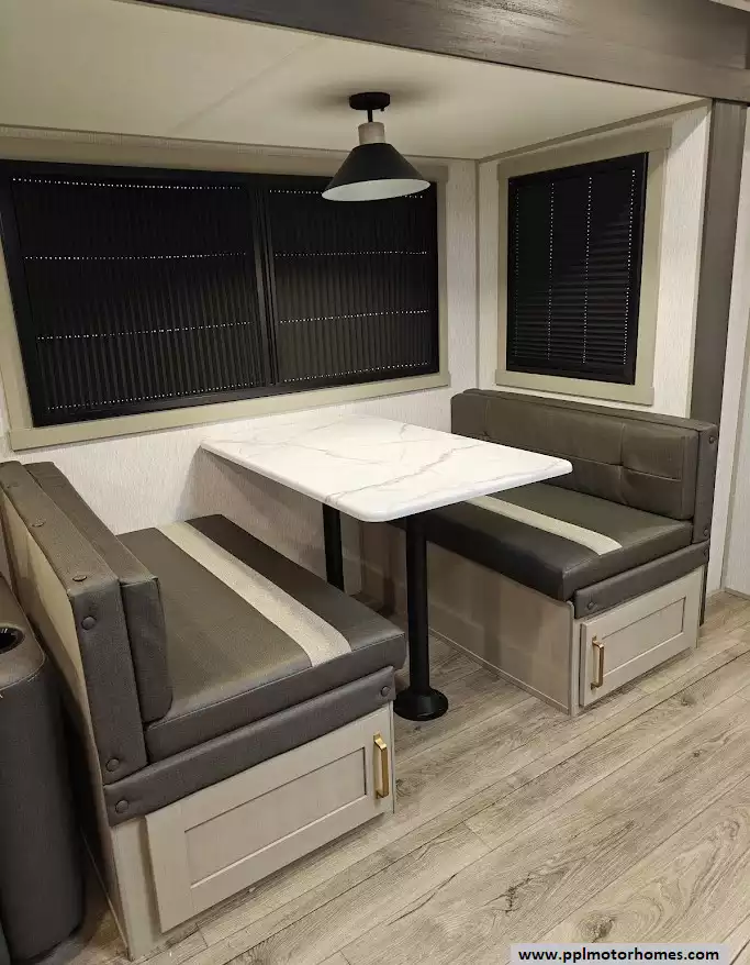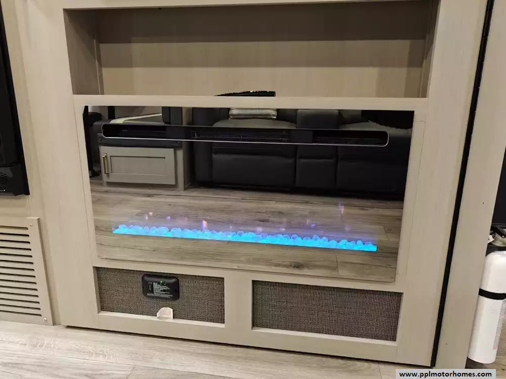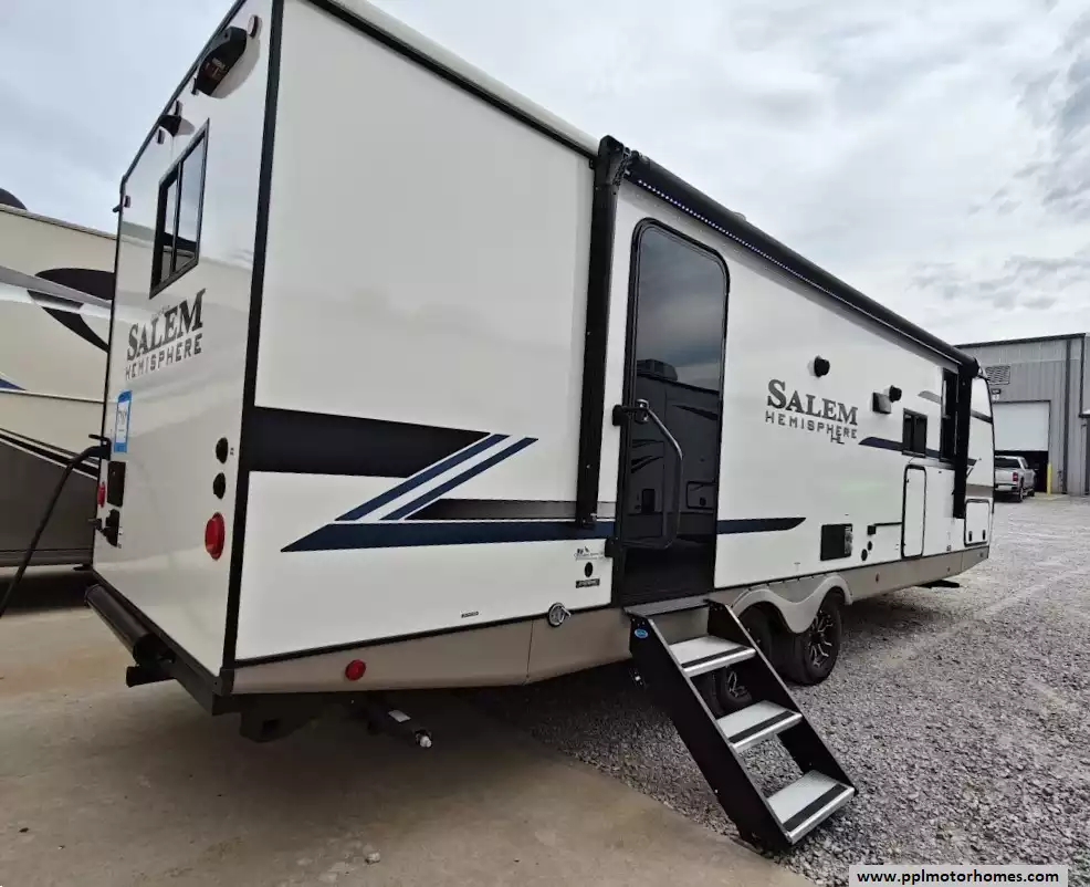 This 2024 Salem Hemisphere 25RBHL is a lightweight travel trailer featuring a rear bathroom and a front private bedroom with an RV queen bed. Key amenities include an outdoor kitchen with a griddle with a LP quick connect and refrigerator, a large slide-out in the main living area, a fireplace, TV, and theater seating. It also has a booth dinette that converts to a bed, a walk-in pantry, and a large pass-through storage compartment. It is equipped with an enclosed underbelly as part of the Expedition Package. Other features include an Electric Tongue Jack, 1-15,00 BTU Ducted Air Conditioner, Double Door Furrion Refrigerator, Automatic Main Awning, JBL Sound System with Indoor and Outside Speakers, Leash Lash, Microwave, 3 Burner Range, and Oven.