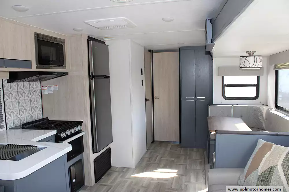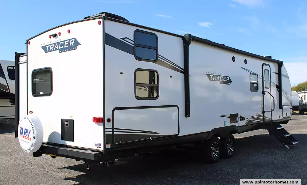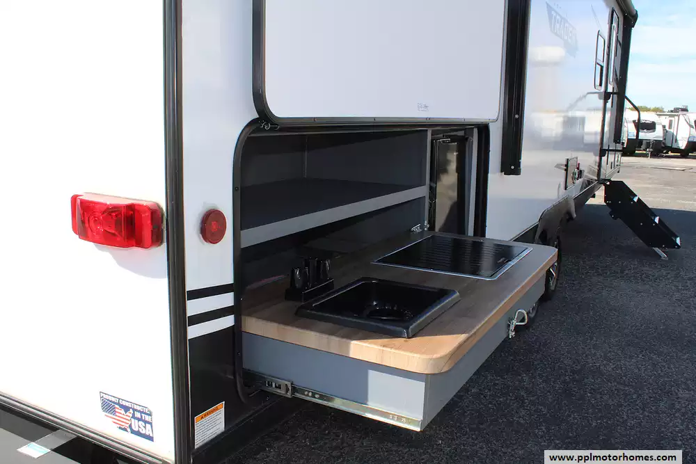 Inside and out, this Tracer impresses with premium features designed for convenience and enjoyment. A fully equipped kitchen with a 3-burner cooktop, oven, microwave, large refrigerator, and pantry ensures you can prepare meals just like at home. Enjoy movie nights in the inviting entertainment area, or take the fun outdoors with the exterior kitchen, perfect for grilling and entertaining. With its 15,000 BTU A/C, 30,000 BTU furnace, residential-style furnishings, and abundant storage, the 2024 Tracer 31BHD-1 isn't just a trailer-it's a destination on wheels, built for making memories in comfort and style.