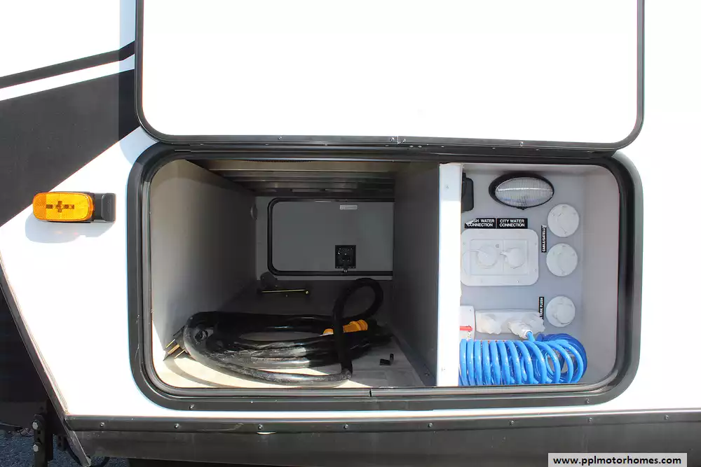 Confidently tow this impressive travel trailer with a properly equipped half-ton or larger vehicle, knowing its aerodynamic design, balanced hitch weight, and durable frame deliver a smooth and stable ride. The 31BHD-1 was engineered to make travel as easy as it is exciting, whether you're headed to a lakefront campsite, the mountains, or your favorite family park. With an enclosed underbelly for all-season protection, power tongue jack, electric stabilizers, and easy-access pass-through storage, setup is a breeze-leaving more time to relax under the 19-foot power awning with LED lighting that sets the perfect evening mood.