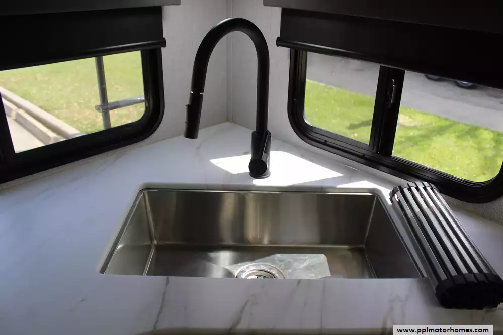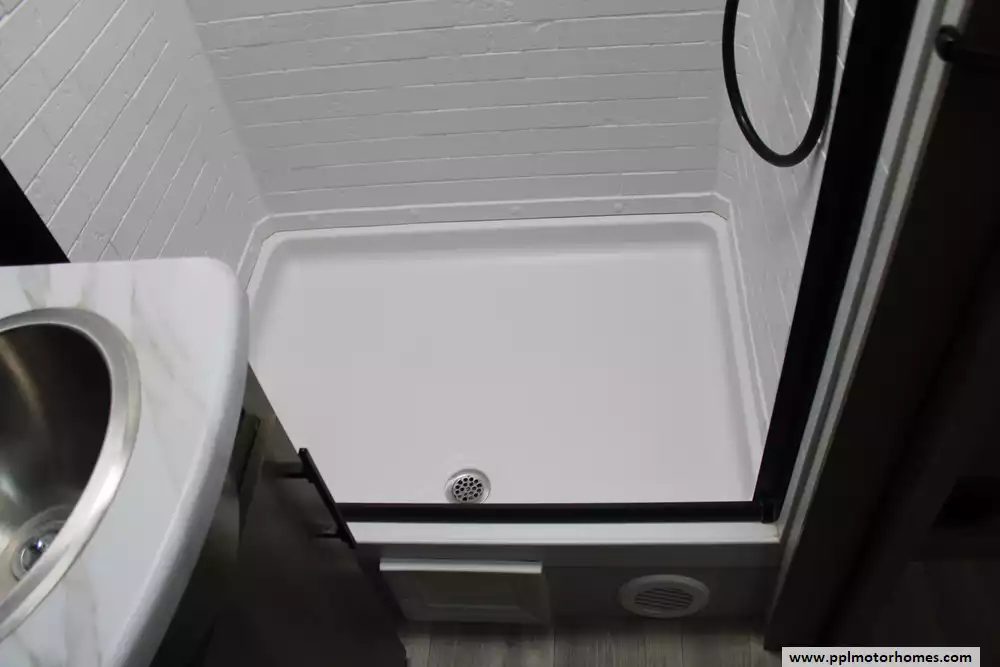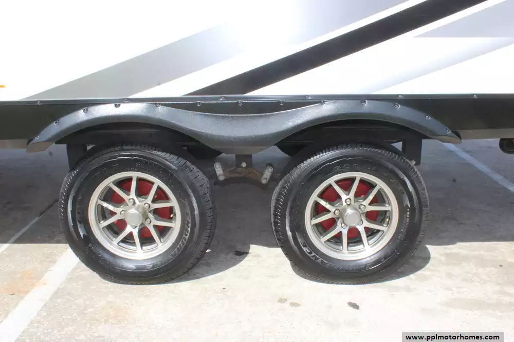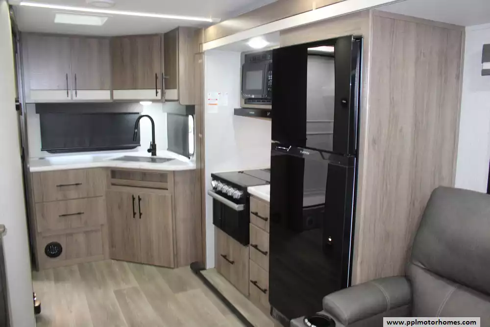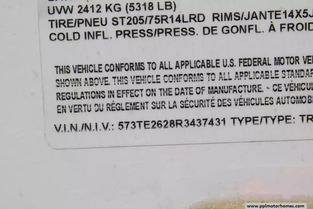 Specs: Length: 26.1 ft., Width: 8 ft., Height: 10.10 ft., Interior Height: 6.6 ft., Total Fresh Water Tank Capacity: 37 gal., Total Grey Tank Capacity: 45 gal., Total Black Water Tank Capacity: 37 gal., Total Propane Tank Capacity: 20 lbs.