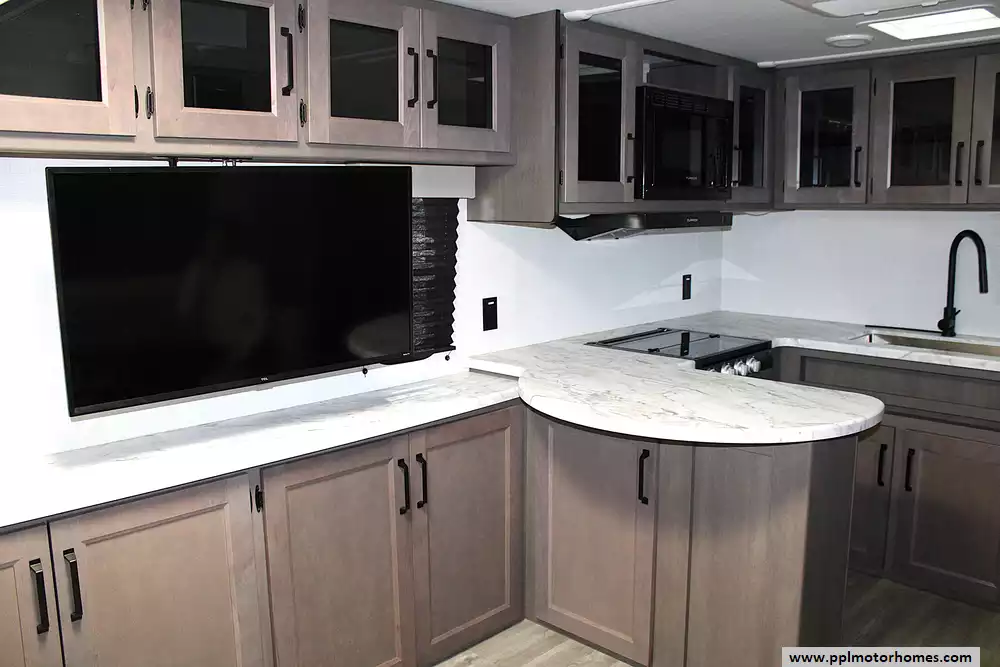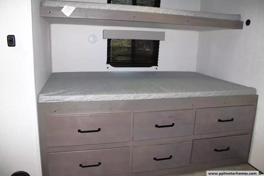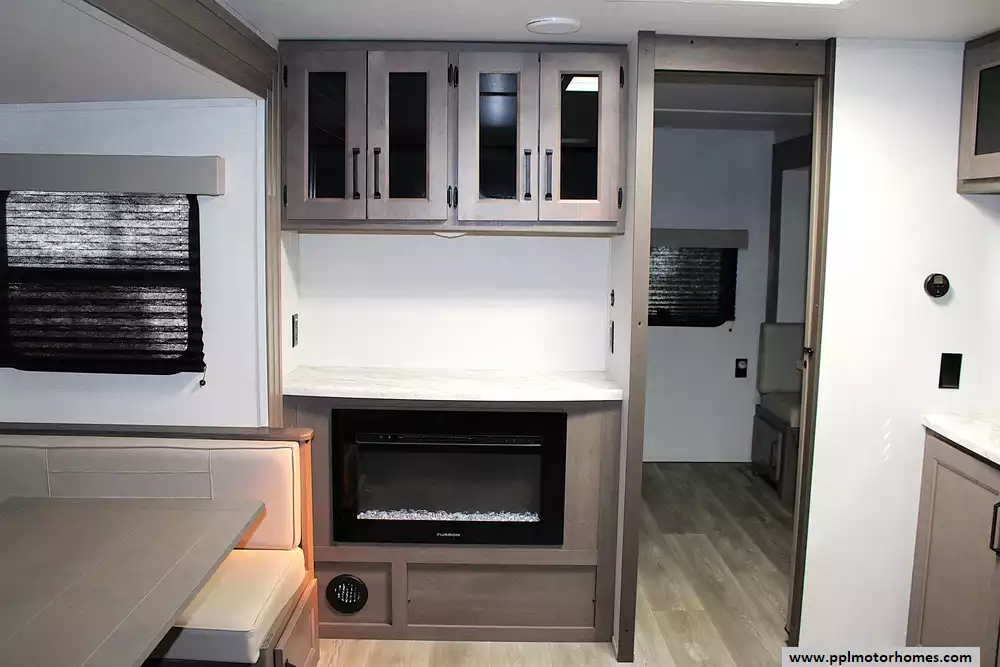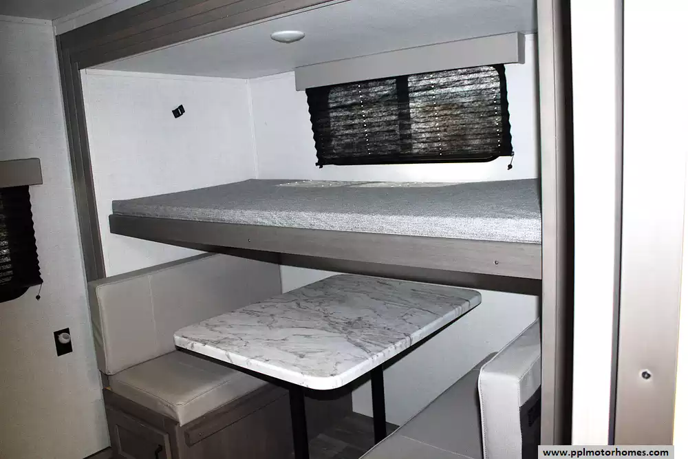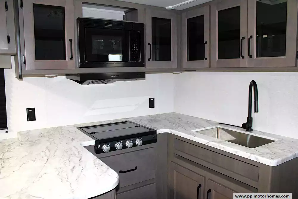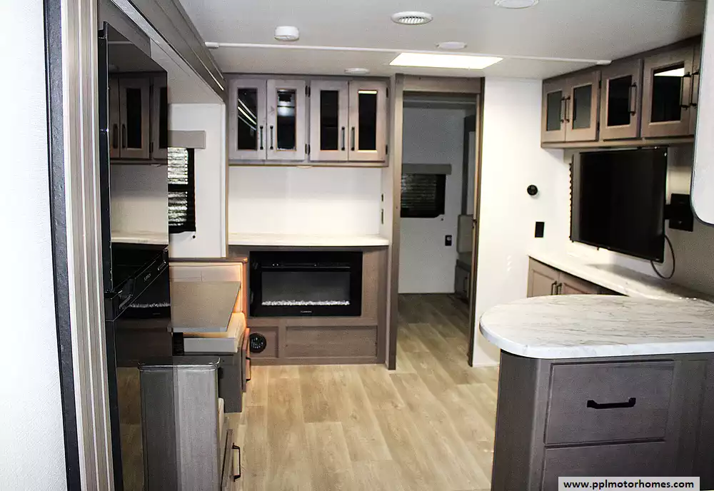 The Transcend 315BH sleeps up to 10 people, making it perfect for large families or groups who want plenty of room to relax. The private bunkhouse offers multiple sleeping areas ideal for kids or guests, while the front master bedroom provides a comfortable retreat with a dedicated bed and storage. In the main living area, the convertible dinette and sofa add extra sleeping space when needed. The kitchen is well equipped with modern appliances, generous counter space, and plenty of cabinetry so preparing meals at the campground is simple and enjoyable.