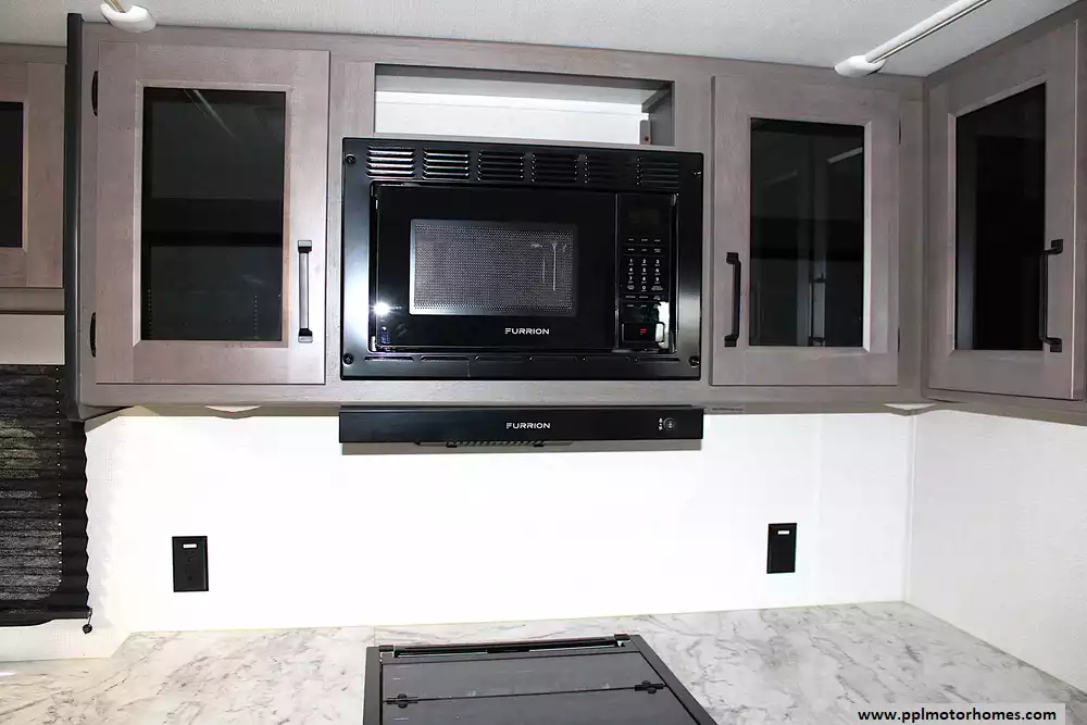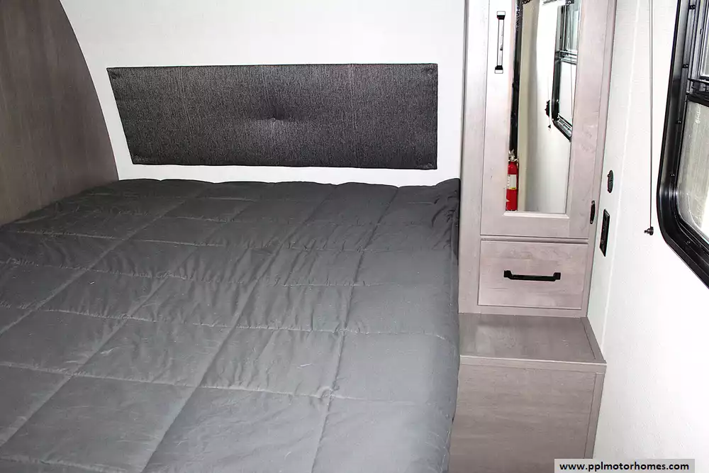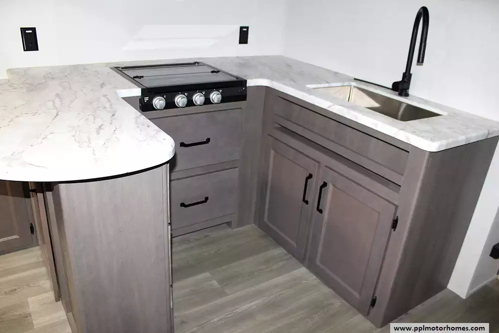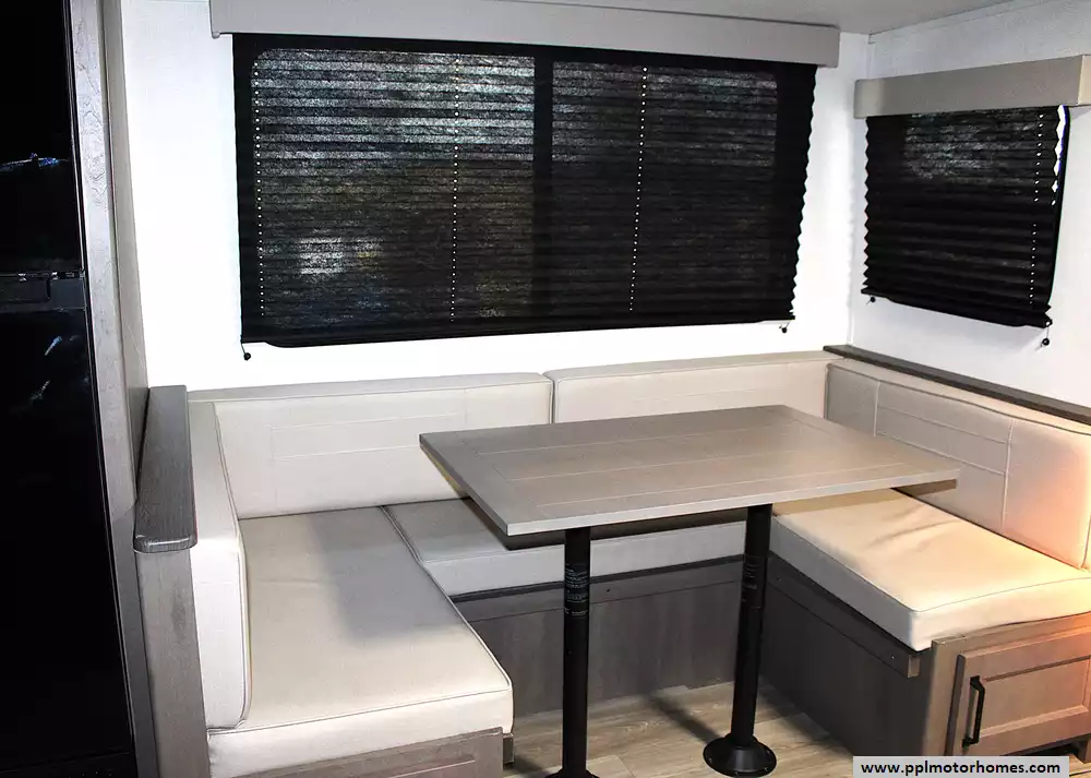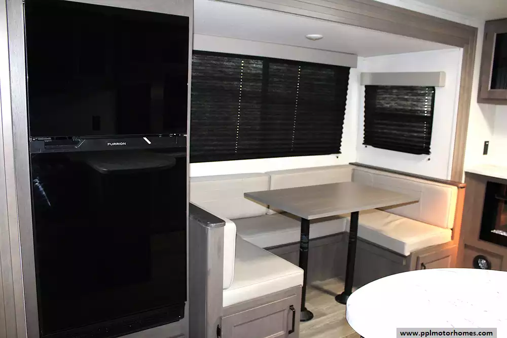 The Transcend 315BH sleeps up to 10 people, making it perfect for large families or groups who want plenty of room to relax. The private bunkhouse offers multiple sleeping areas ideal for kids or guests, while the front master bedroom provides a comfortable retreat with a dedicated bed and storage. In the main living area, the convertible dinette and sofa add extra sleeping space when needed. The kitchen is well equipped with modern appliances, generous counter space, and plenty of cabinetry so preparing meals at the campground is simple and enjoyable.