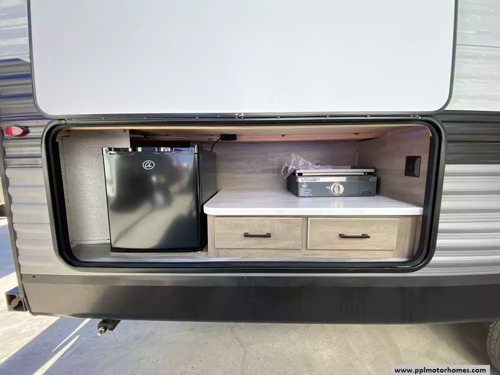 This 2024 Jay Flight Slx 261BHS has an Electric Tongue Jack, 1 Slide-out, 1 Non-Ducted And 1 Ducted Air Conditioner, Invision Double Door 12v Refrigerator (Additional Refrigerator Present), Automatic Main Awning, Washer/Dryer, Solar Panel, Satellite Dish, Outside Speakers, 2 TVs, Outdoor Griddle, Outside Shower, Microwave, 3 Burner Range, Oven