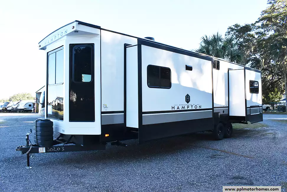 This 2024 Crossroads HAMPTON 372FDB has a 3 Slide-outs, 2 Ducted Air Conditioners, Residential Samsung Refrigerator, In-Fridge Ice Maker, Automatic Main Awning, Washer/Dryer Connections, Outside Speakers, TV, Fireplace, Microwave, 4 Burner Range, Oven
