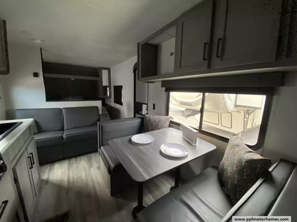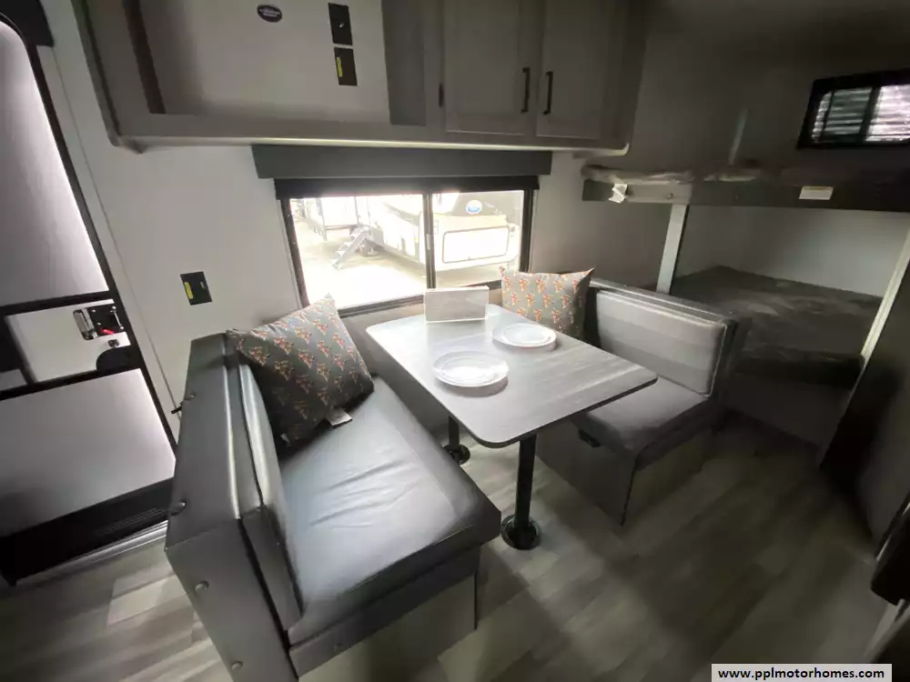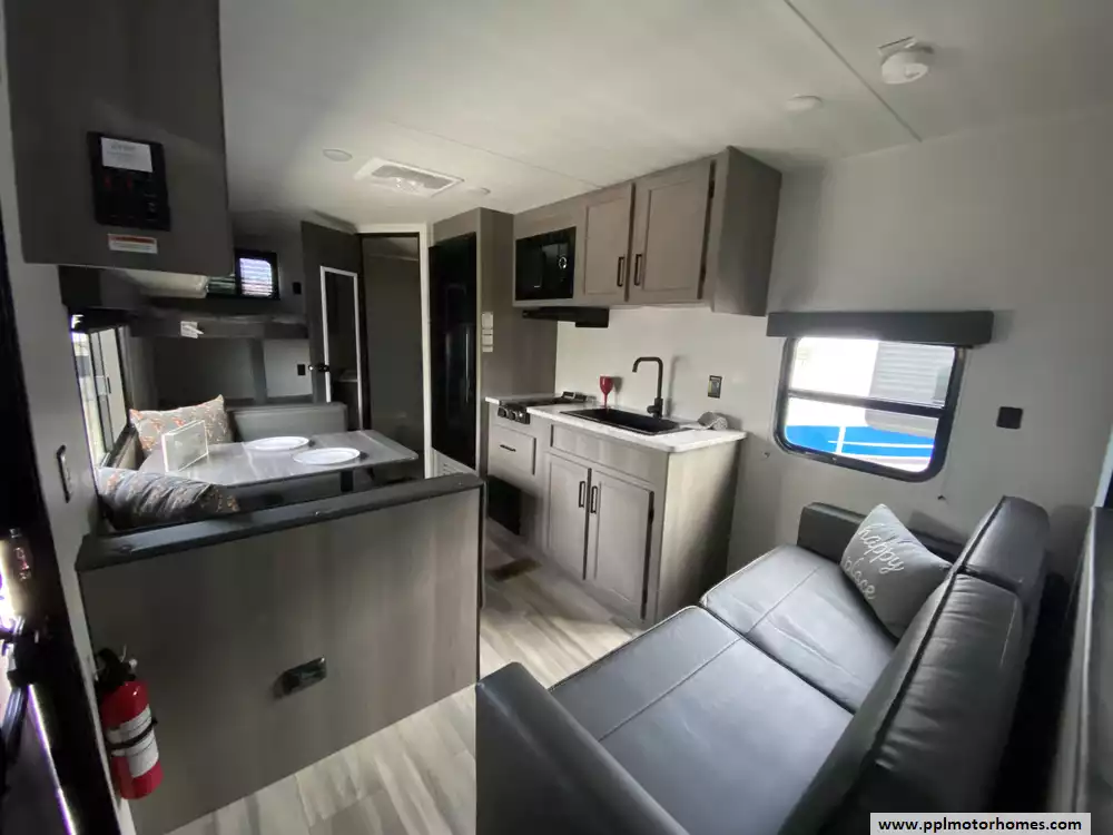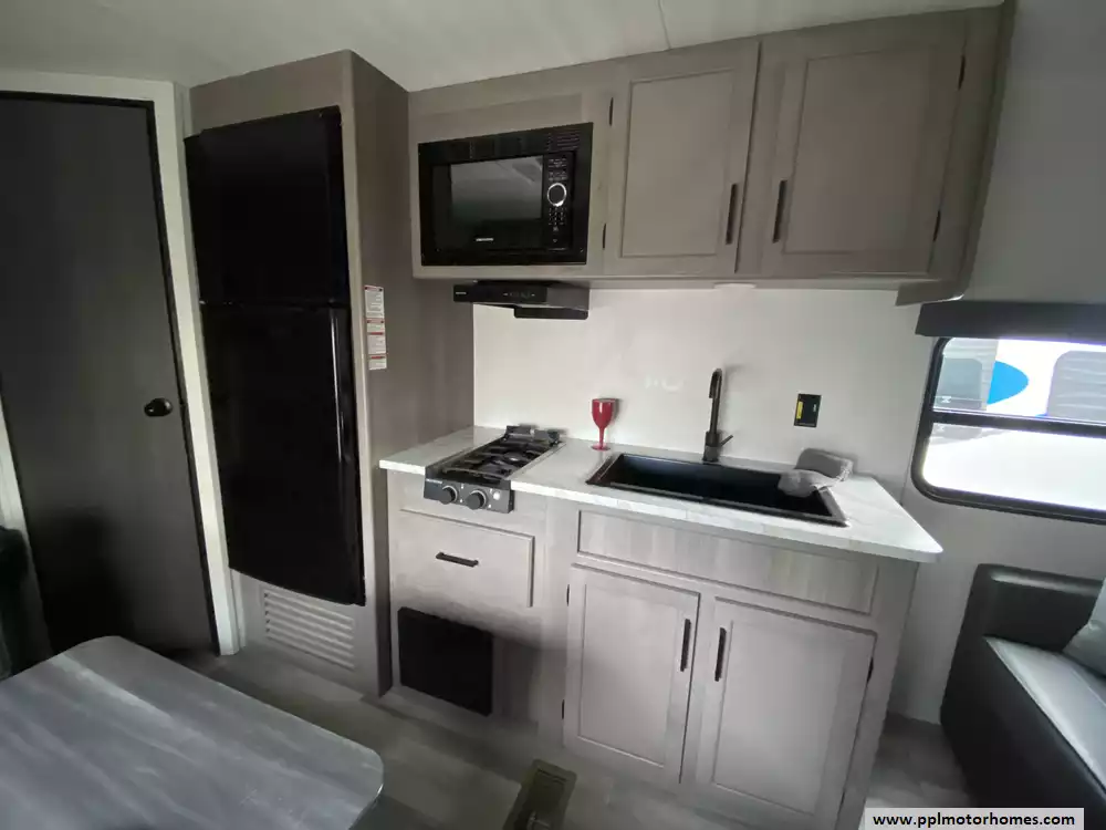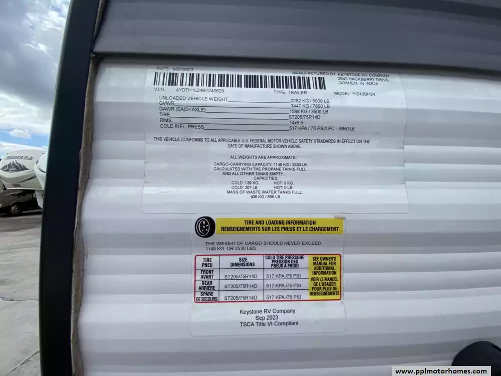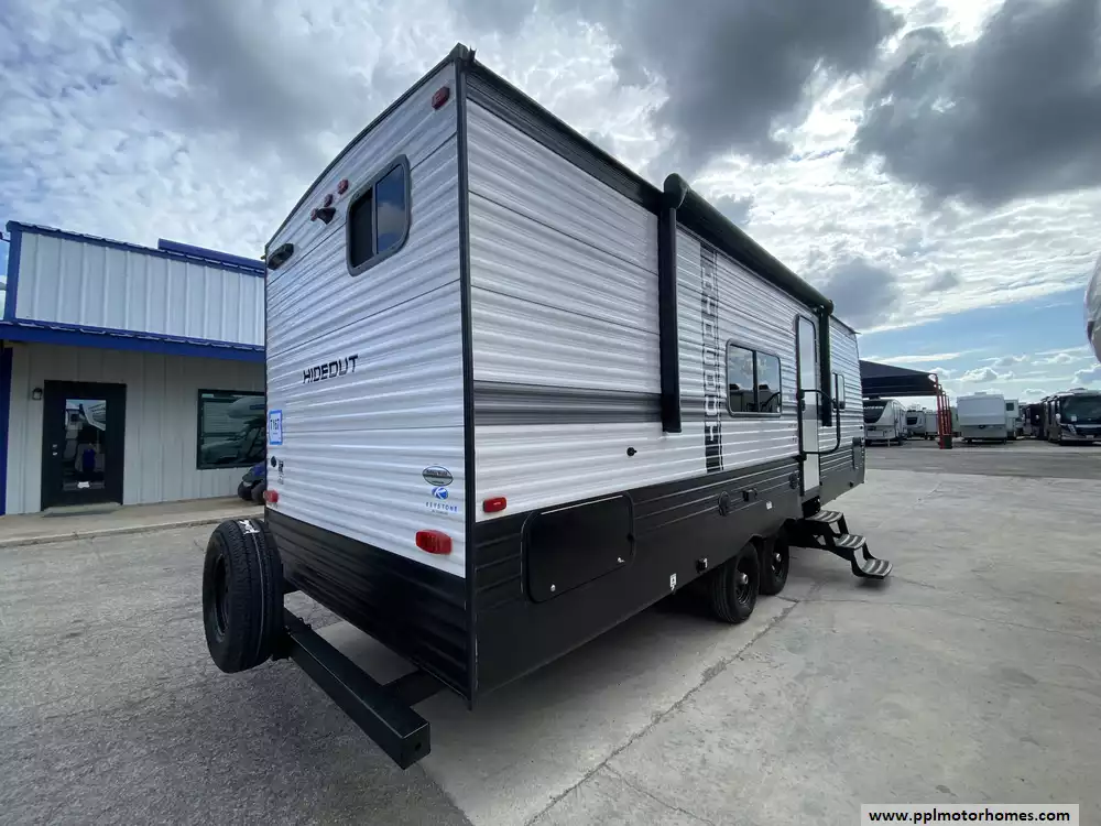 This 2024 Hideout 240BH has an Electric Tongue Jack, 1 Non-Ducted Air Conditioner, Double Door 110v Ge Refrigerator, Automatic Main Awning, Satellite Dish, Outside Speakers, Microwave, 2 Burner Range