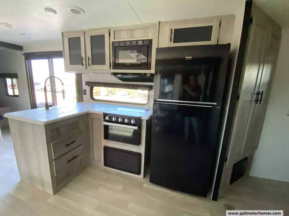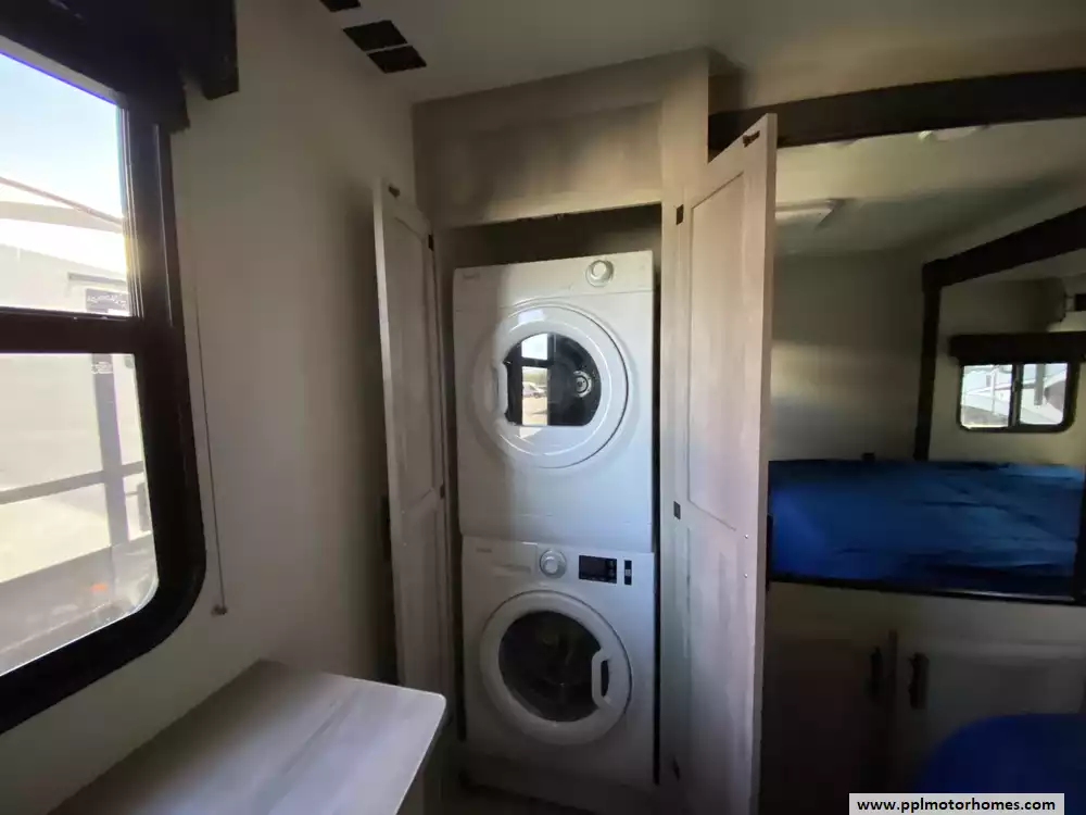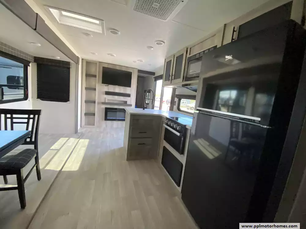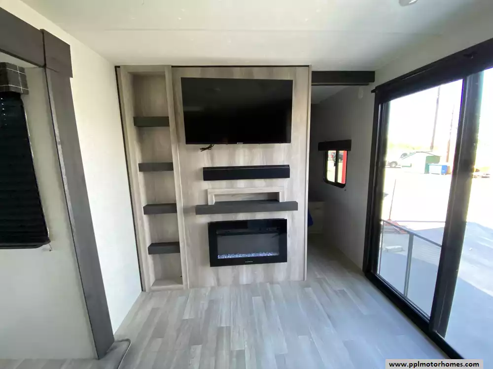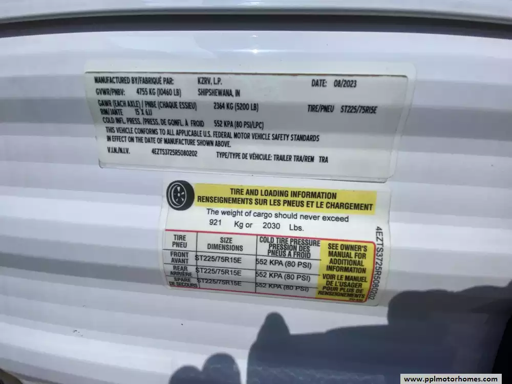 The interior is designed for modern living, featuring a double door 12v residential refrigerator and a full kitchen suite complete with a microwave, three-burner range, and oven. You can stay perfectly climate-controlled in any weather thanks to the dual ducted air conditioners, while the cozy fireplace and included TV provide the perfect atmosphere for relaxation. This model is exceptionally prepared for long-term convenience with dedicated washer and dryer connections and ample storage throughout. For those who love the outdoors, the automatic main awning, integrated outside speakers, and convenient outside shower make entertaining a breeze. The Sportsmen 362DB delivers the high-end residential experience KZ is known for, offering all the practical features you need for a premium camping lifestyle.