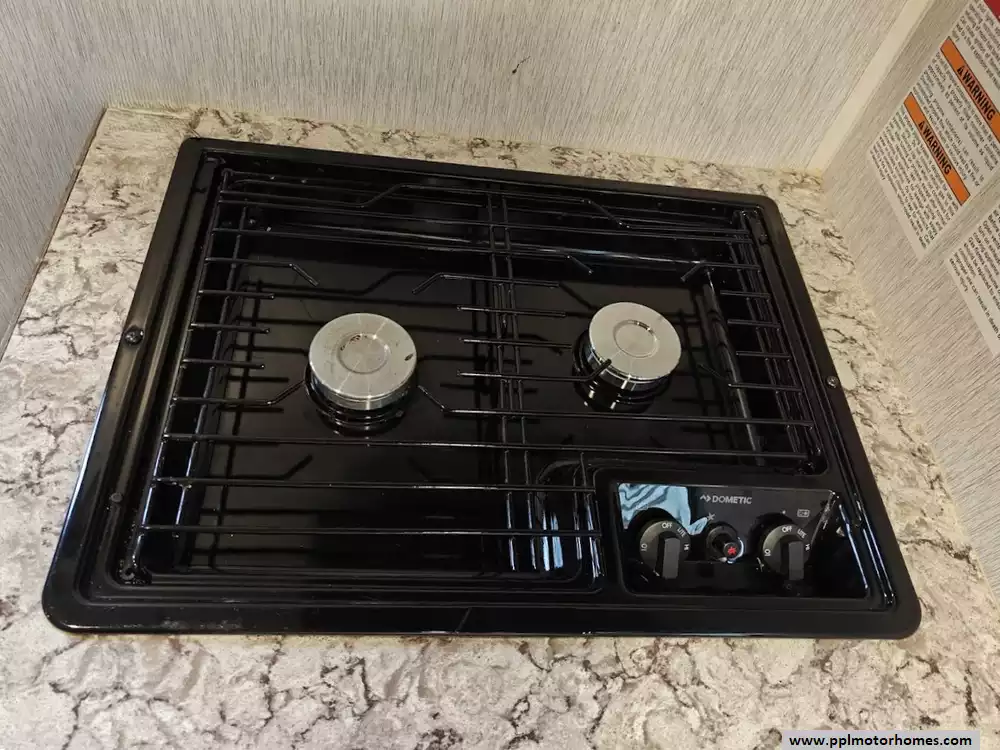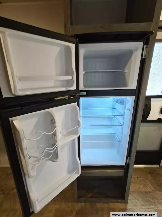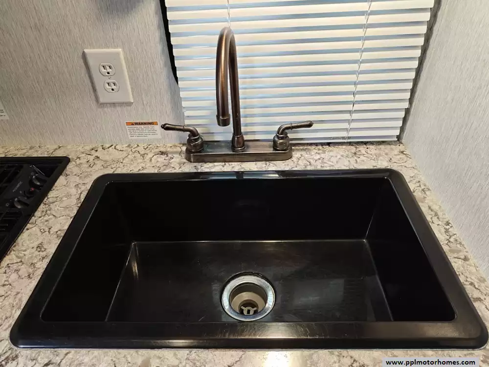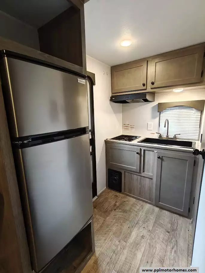 The kitchen is situated in the rear corner and includes a two-burner cooktop, a large farmhouse-style sink, a 4.3 cu. ft. 12V refrigerator, and overhead storage.