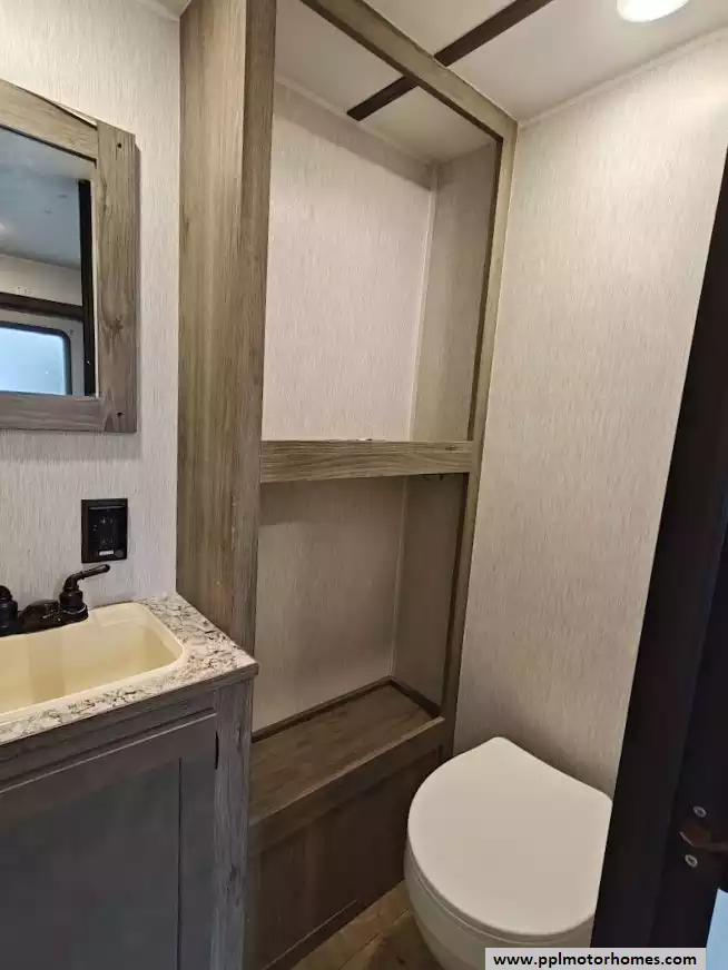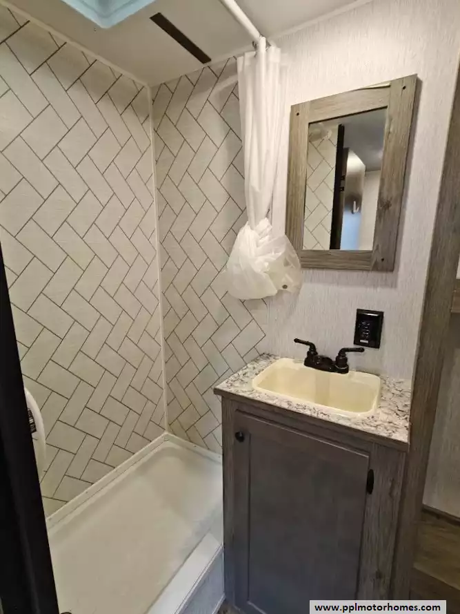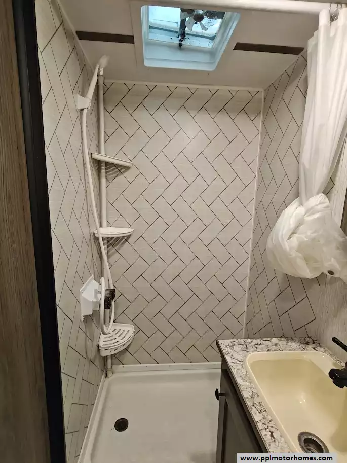Adjacent to the kitchen is the full bathroom, which contains a shower, toilet, vanity sink, and a power roof vent.