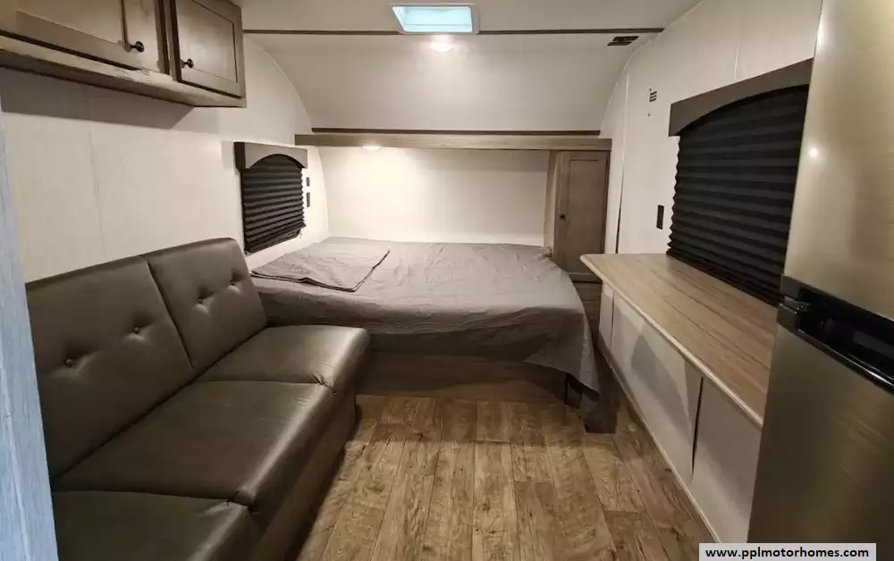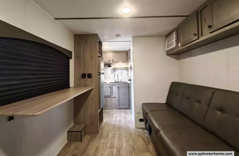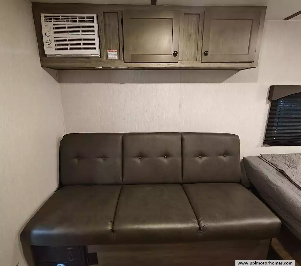 The middle section of the RV features an "eatery bar" or bar top with fold-down stools for dining. Across from this is a 68" jackknife sofa that provides a place to relax and can be converted into an additional bed for an overnight guest.