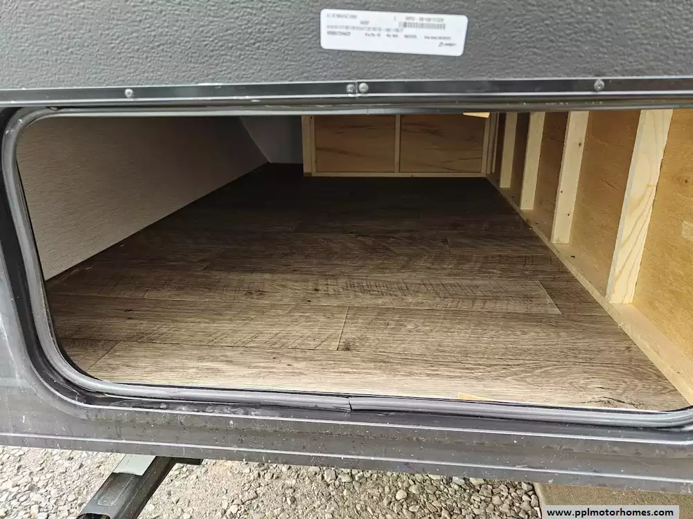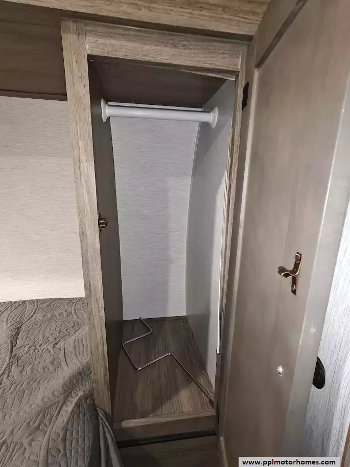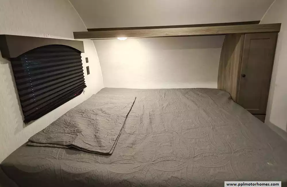 The front of the trailer is dedicated to the main sleeping area, which houses an RV queen bed. This area also includes shelving for personal belongings and a closet for clothes storage.