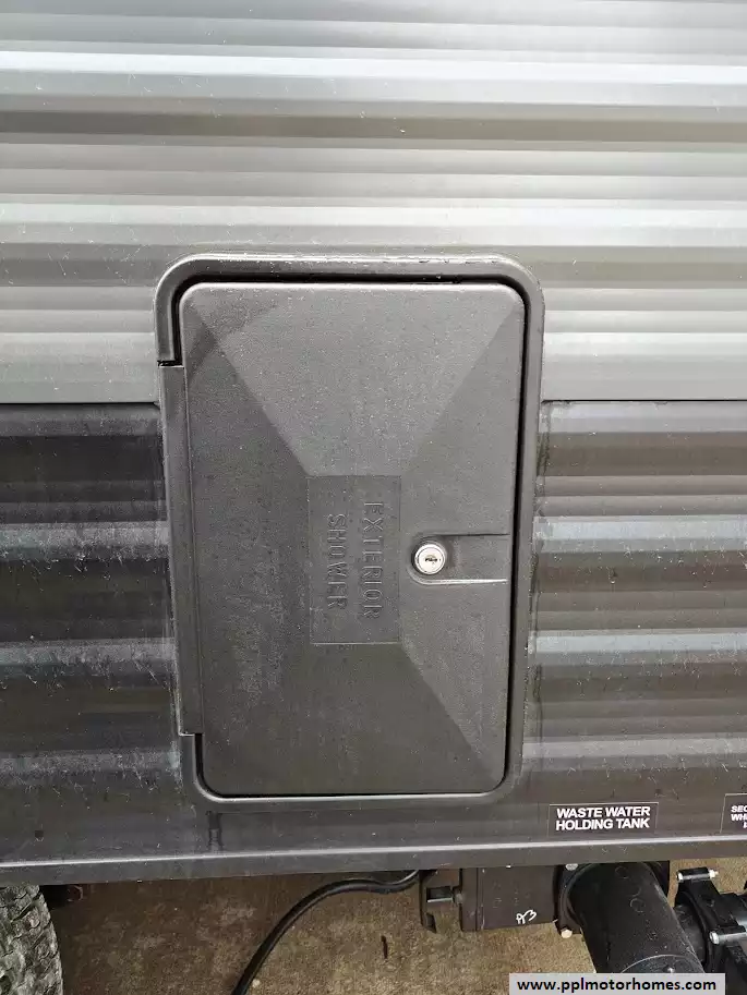 An exterior shower with hot and cold water is a standard feature, useful for cleaning off after outdoor activities or washing pets.
