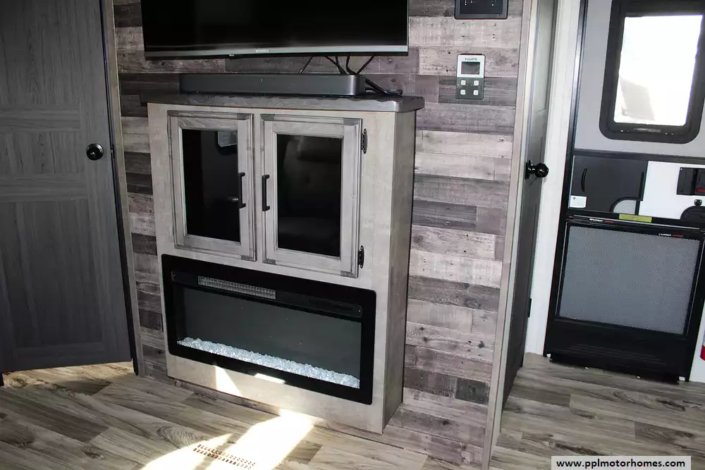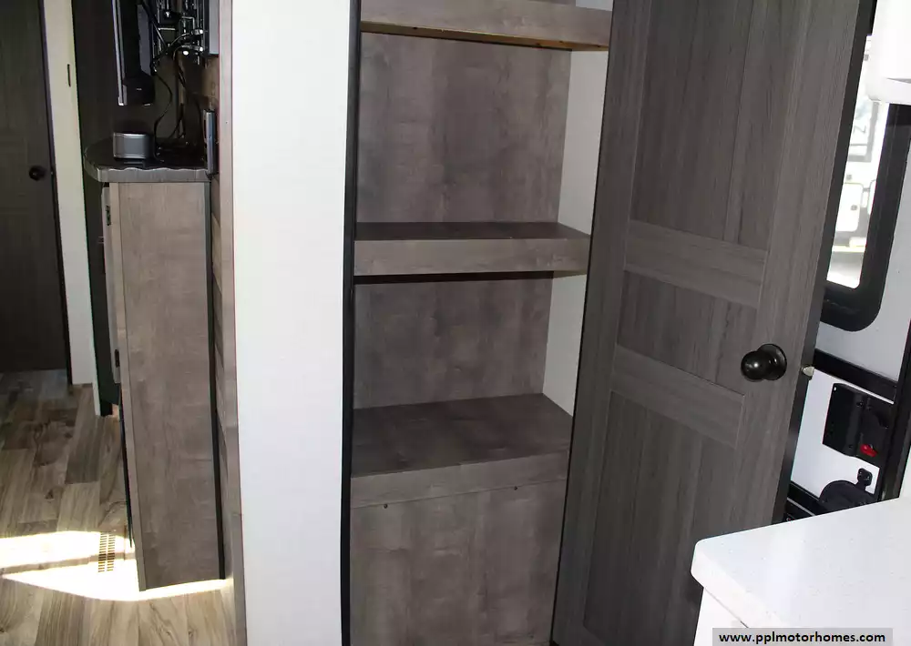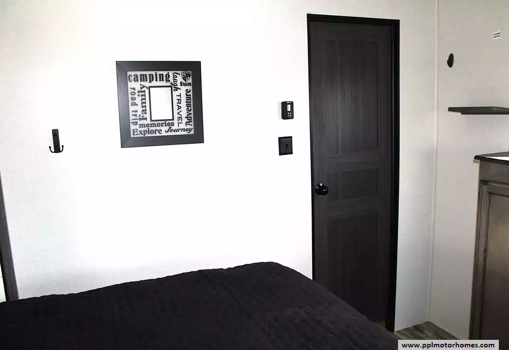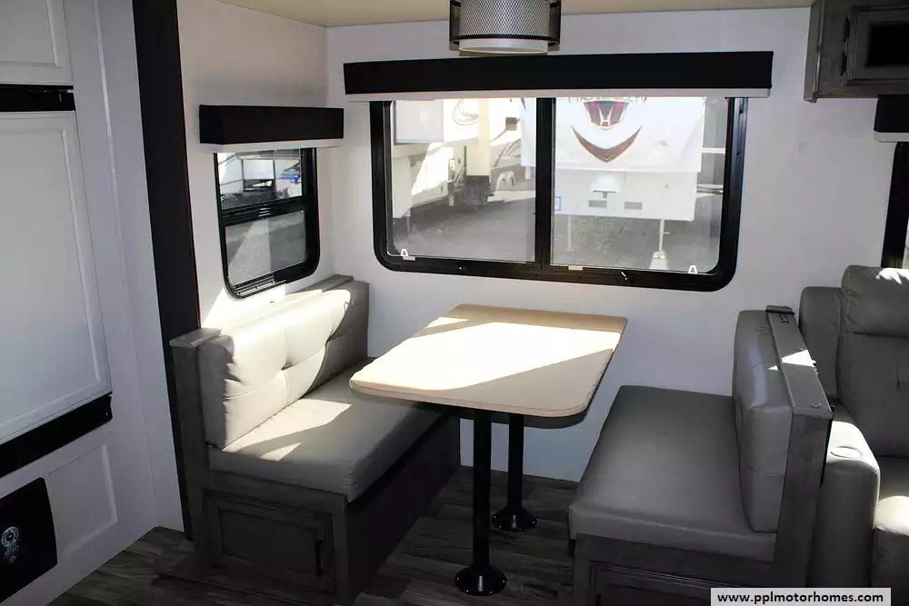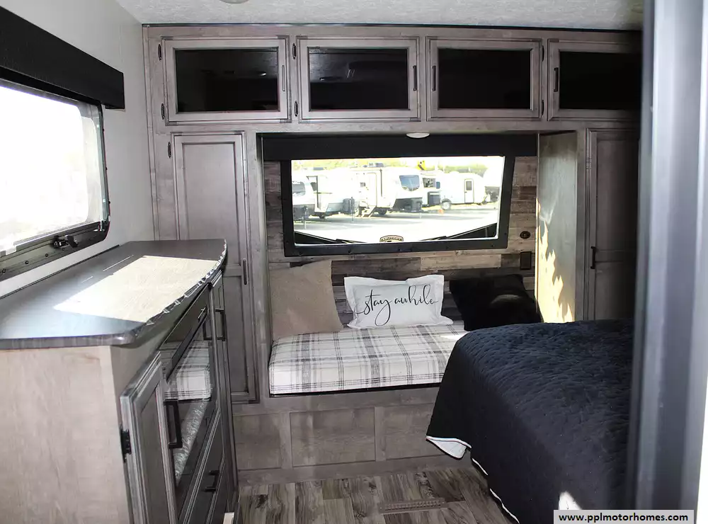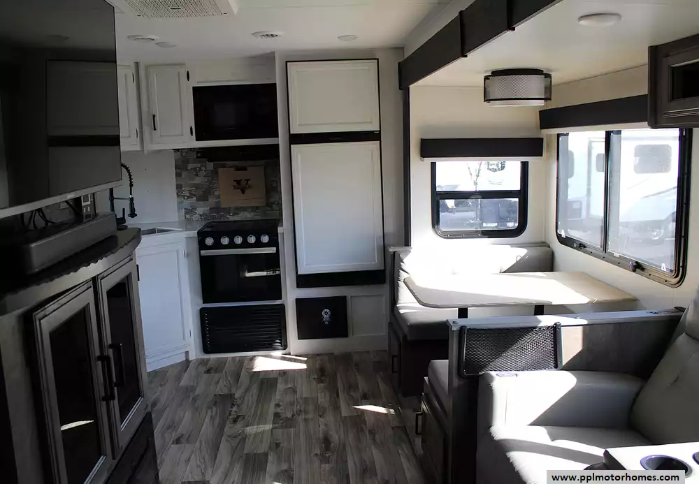 Up front, the private master suite includes a king-size "Sleep Tight" bed slide, dual wardrobes, and dresser space for an at-home feel. With the convertible sofa and dinette, this unit comfortably sleeps up to 4-6 people, making it ideal for couples who enjoy extra space or small families who love to travel in comfort. The Touring Edition trim level adds premium touches like LED lighting, residential vinyl flooring, and an enclosed underbelly for extended-season camping.