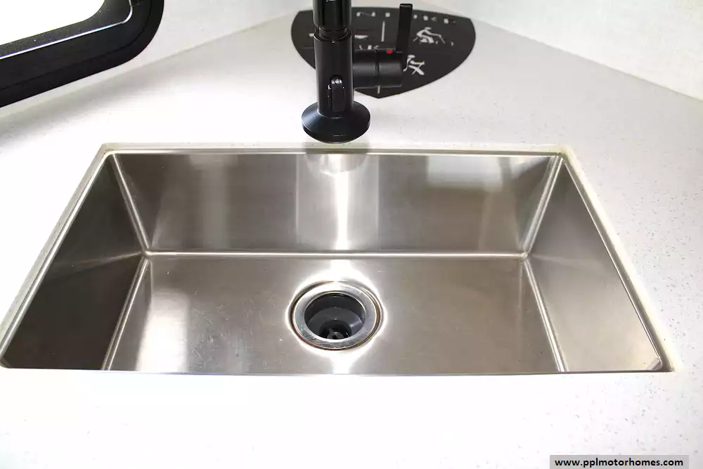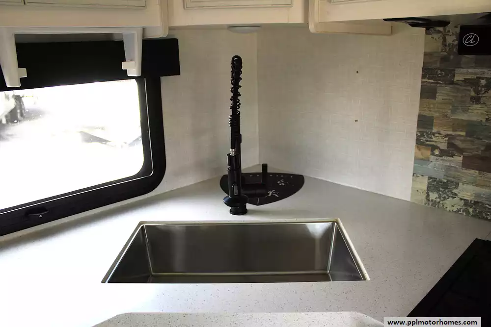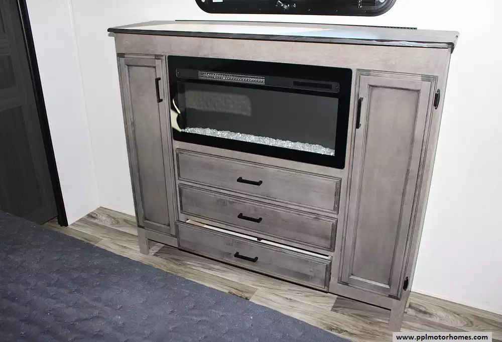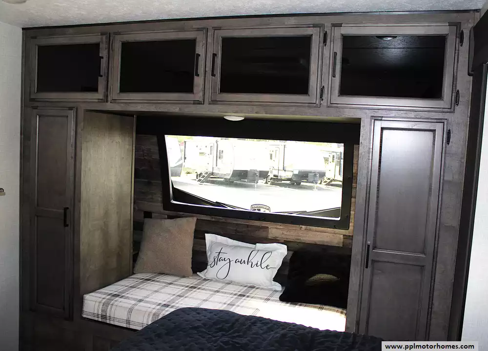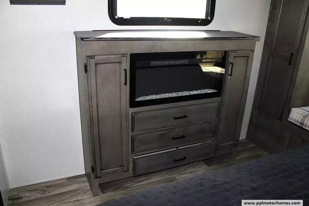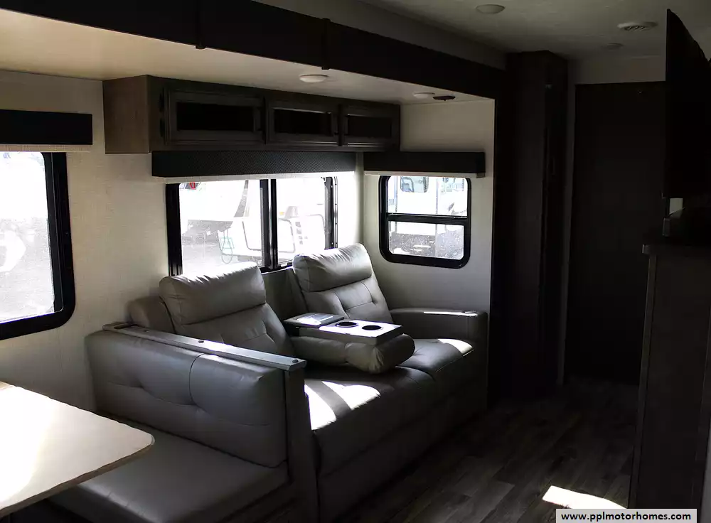 Up front, the private master suite includes a king-size "Sleep Tight" bed slide, dual wardrobes, and dresser space for an at-home feel. With the convertible sofa and dinette, this unit comfortably sleeps up to 4-6 people, making it ideal for couples who enjoy extra space or small families who love to travel in comfort. The Touring Edition trim level adds premium touches like LED lighting, residential vinyl flooring, and an enclosed underbelly for extended-season camping.