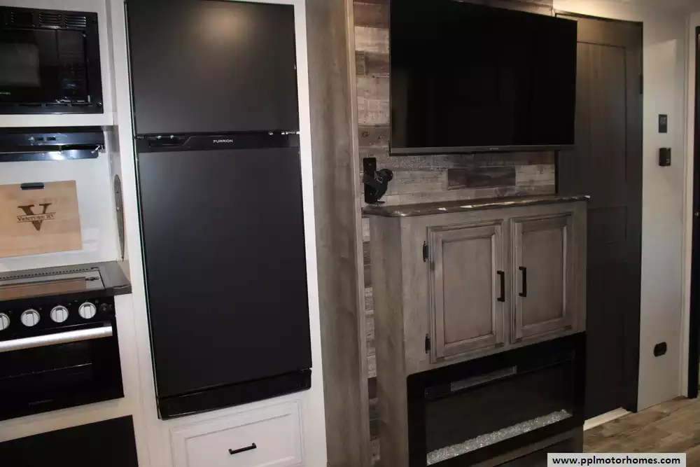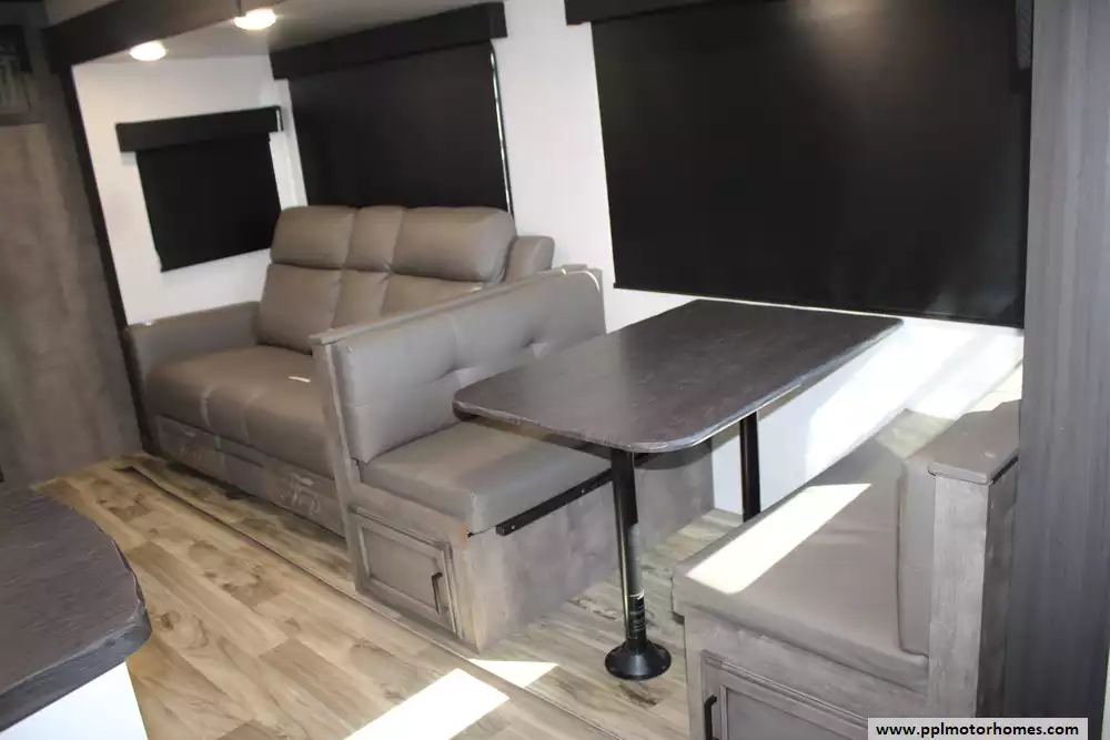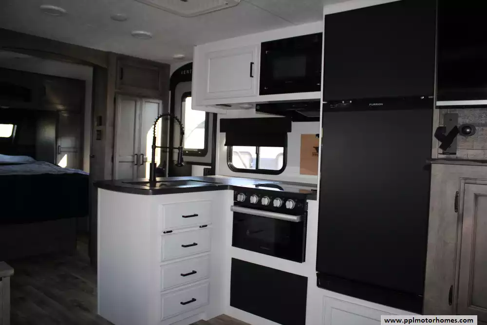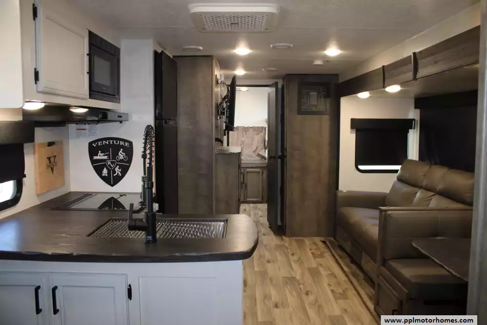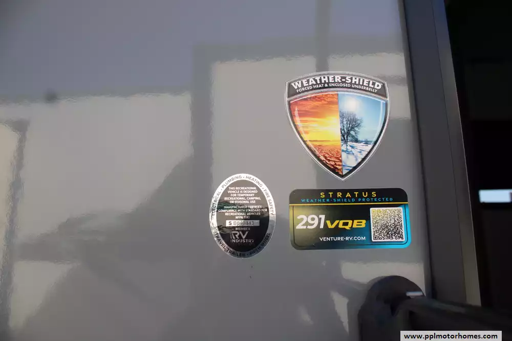 The 2024 Venture RV Stratus 291VQB is a well-equipped travel trailer designed for family comfort and modern style. At roughly 33' 11" in length with a width of 96" and exterior height including A/C of 10' 10", it offers spacious living without being overwhelmingly large. Built on a strong NXG-frame with Azdel laminated sidewalls, it features full-sized amenities such as a 10 cu ft refrigerator, a tankless water heater, and an impressive cargo carrying capacity of about 2,250 lbs (GVWR - 9,290 lbs). The interior blends modern farmhouse decor with residential touches, antique-white glazed cabinetry, live-edge countertops, large panoramic windows, brand-new mattress, and upgraded furniture bring a refined feel. For those who travel in style and need flexibility for kids or guests, the 291VQB floorplan offers a smart floorplan, thoughtful amenities and build-quality features that make it a strong contender in its class.