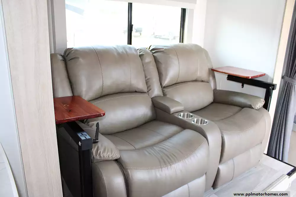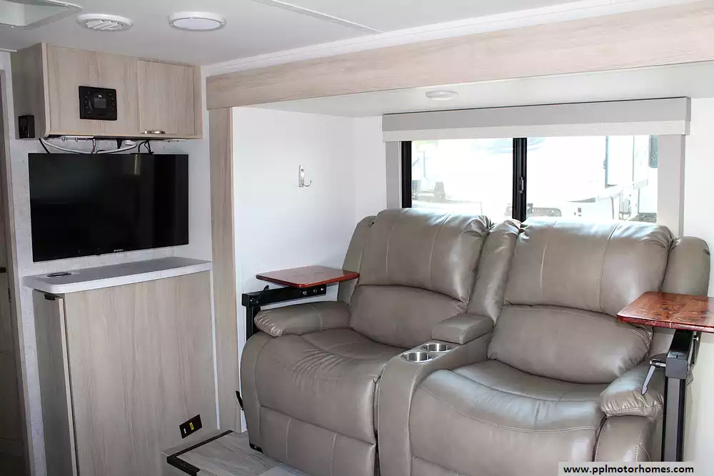 Inside, you'll find a smart floorplan that maximizes every inch of space. The front sleeping area offers the versatility of two twin beds that easily convert into a spacious king, while the upgraded recliners in place of a couch provide extra comfort for relaxing evenings. The dinette slide not only opens up the living space but also converts for additional sleeping, allowing this trailer to comfortably sleep up to 4 people. A roomy rear bath with wardrobe storage makes extended stays practical, while the well-equipped kitchen offers a 3-burner cooktop, convection microwave, and large 10.3 cu. ft. refrigerator for all your cooking needs.