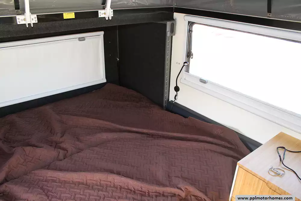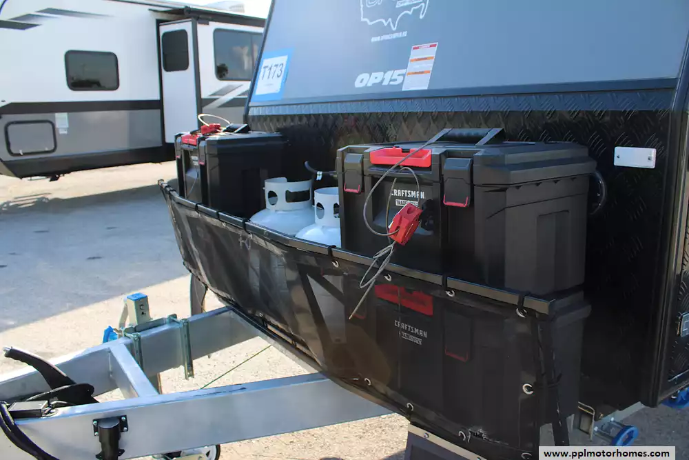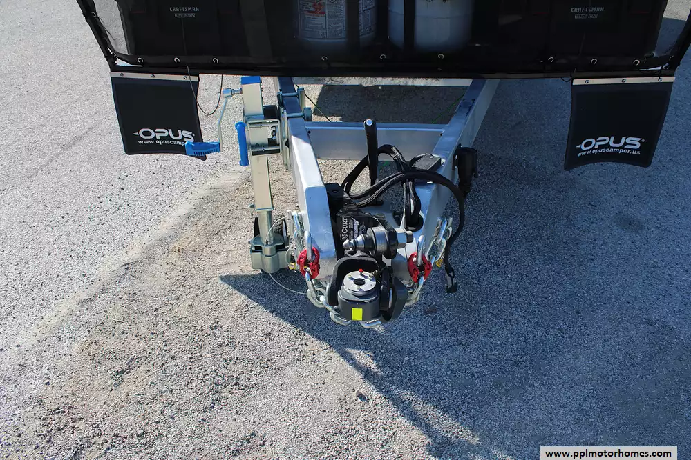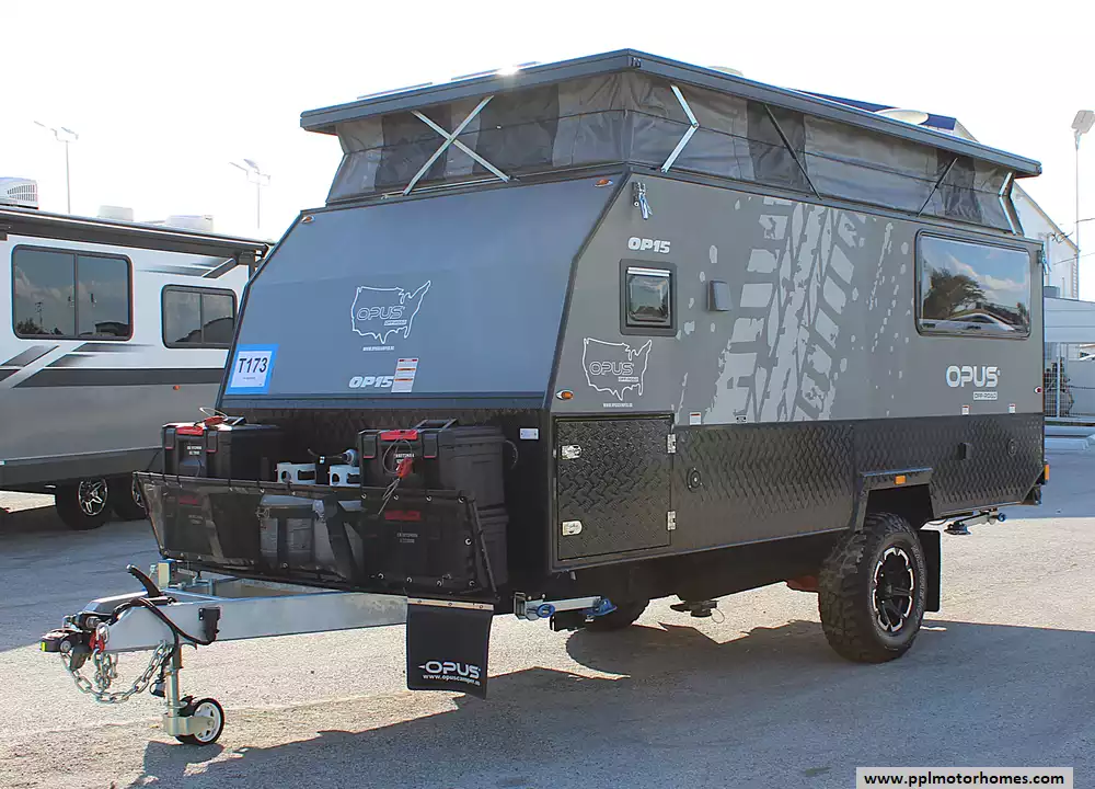 On the road, the OP15 measures approximately 23 ft in length (travel mode) and stands about 8 ft 10 in tall when closed. When opened up for camp, it expands to roughly 23 ft 5 in and about 10 ft tall, delivering generous interior height and floor space for relaxing. Built tough with a strong chassis and independent suspension, the OP15 is tow-ready by a capable truck or SUV and thanks to its modest hitch weight of around 410 lbs, setup is straightforward.