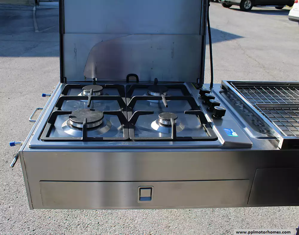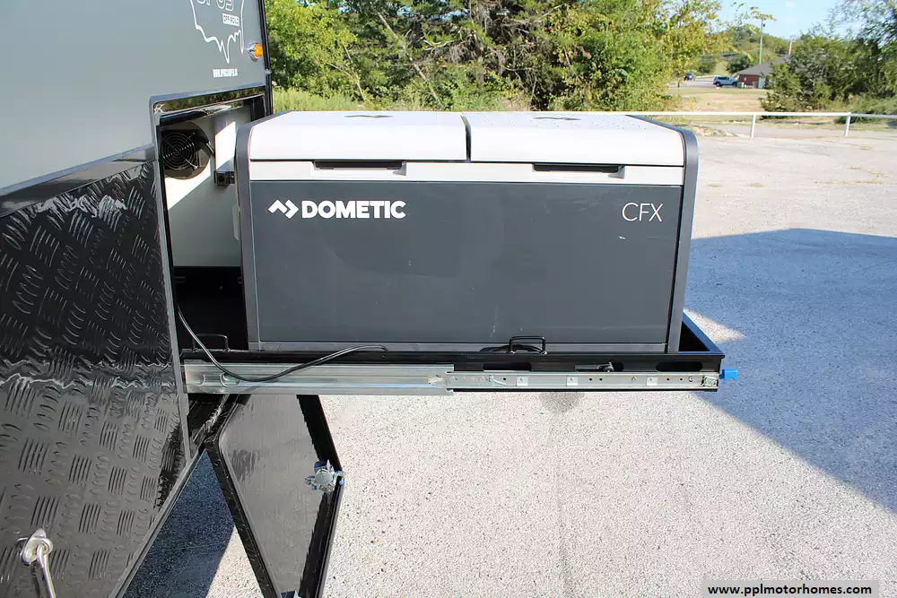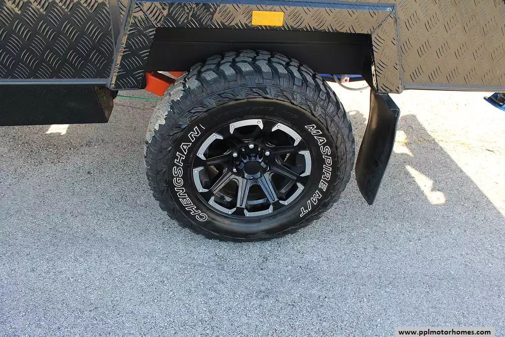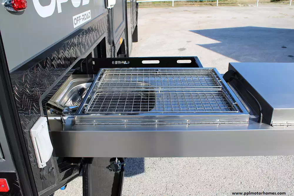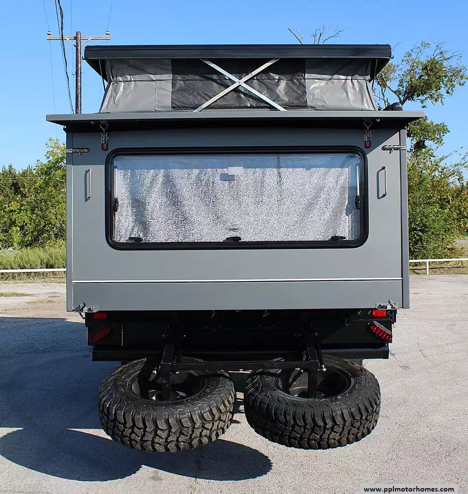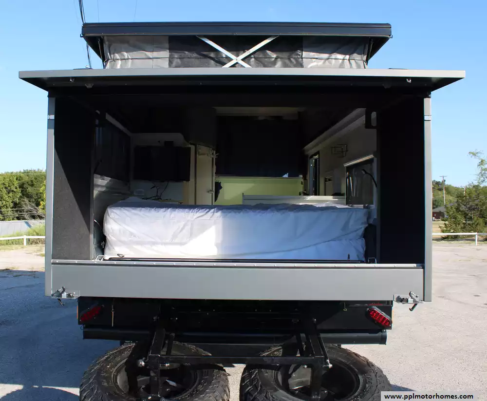 Step inside and you'll discover upscale features normally reserved for larger rigs: king-sized bed, upper and lower bunks, full indoor bathroom with shower and toilet, and a slide-out outdoor kitchen with four-burner stove and 12 V fridge/freezer combo. Solar power and lithium battery options make extended off-grid stays possible, and the articulating off-road hitch plus off-road tires mean you're not limited to paved campsites. Whether you're chasing sunset views or powering through rugged terrain, this trailer offers the perfect blend of form, function, and freedom.