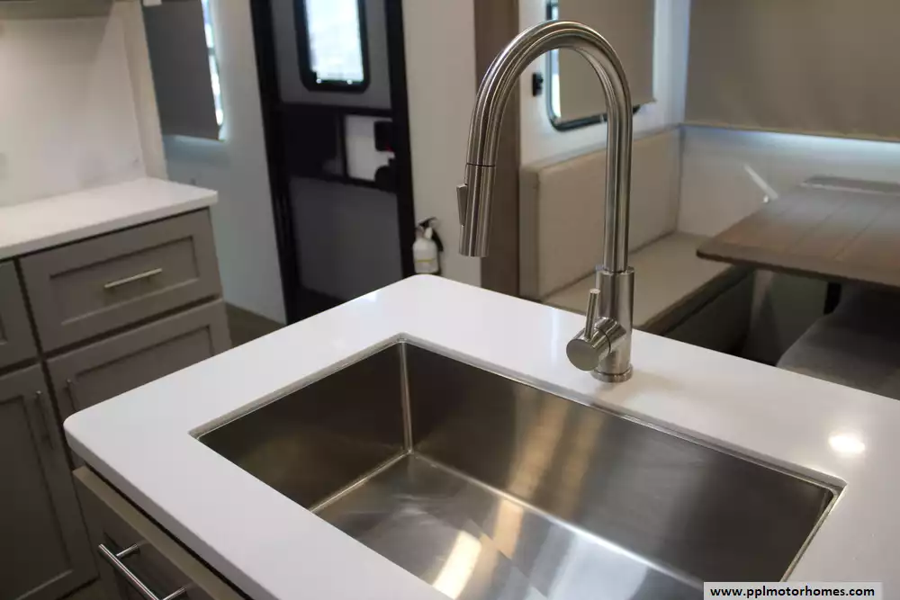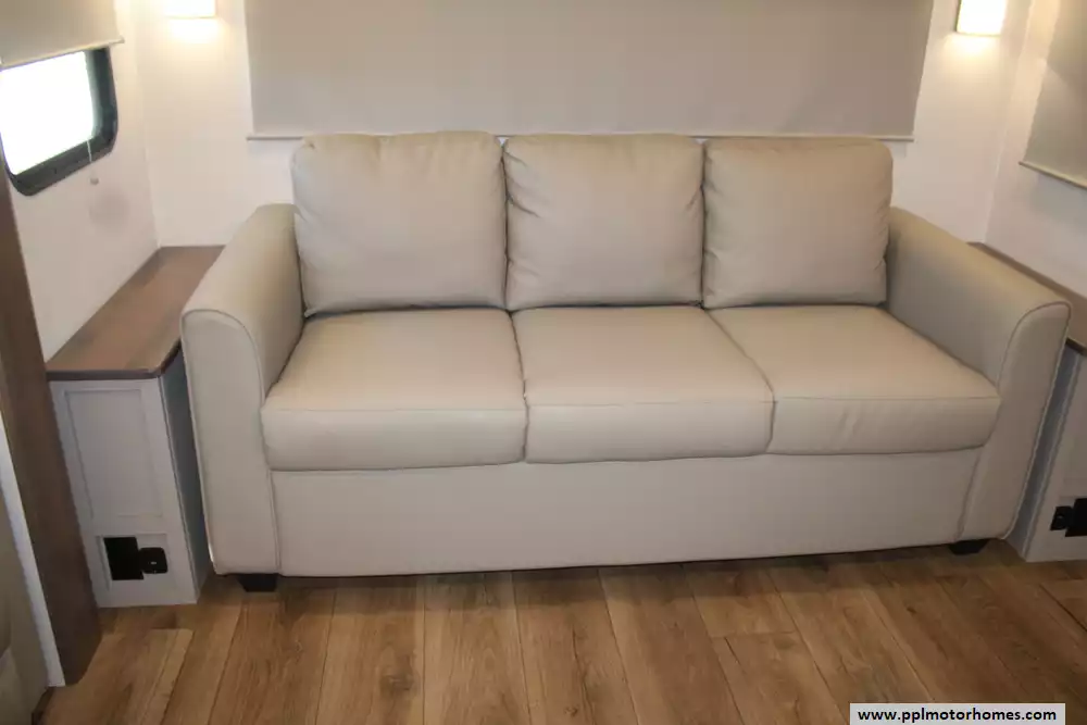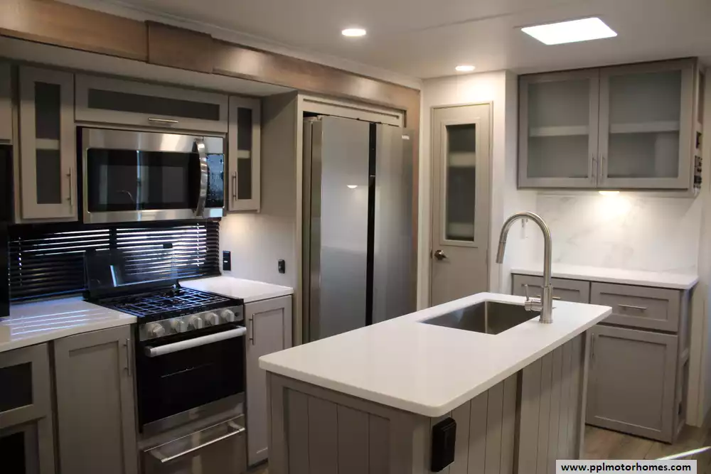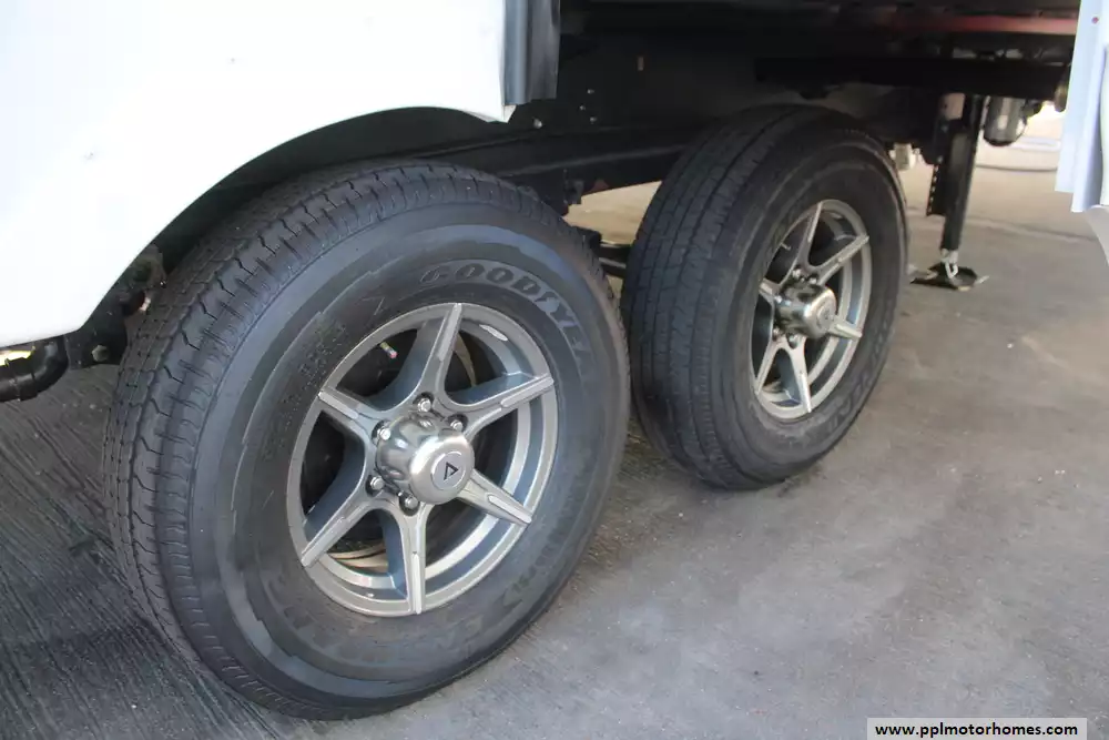 The 2025 Alliance Avenue 332RL is a luxury travel trailer built to deliver residential comfort with premium features and a spacious, rear-living layout. At nearly 38 feet in length, with a dry weight around 10,200 lbs and a hitch weight of approx 1,200 lbs, it includes three slides to maximize interior room. You'll find wide-body construction with composite sidewalls (Azdel), a walkable PVC roof, dual air conditioners, and a powerful furnace for climate control. The floorplan features a front bedroom (queen slide with king optional), a full kitchen island, floating dinette plus movable ottoman, and in the back a cozy rear living room with dual recliner theater seating opposite a sofa and a 50-inch HDTV on a swing arm for flexible viewing. With large water tanks (71 gal fresh, 124 gal grey, 53 gal black), significant storage, solid surface counters, and no carpeting throughout, it's built both for style and durability, ideal for long trips or full-time escapes.