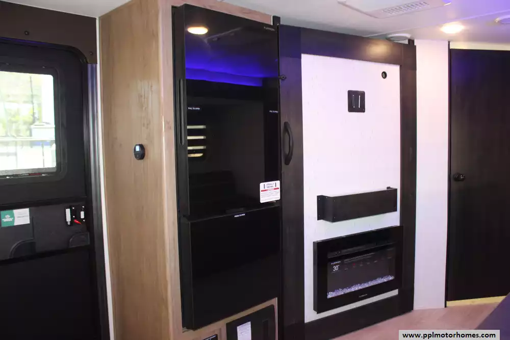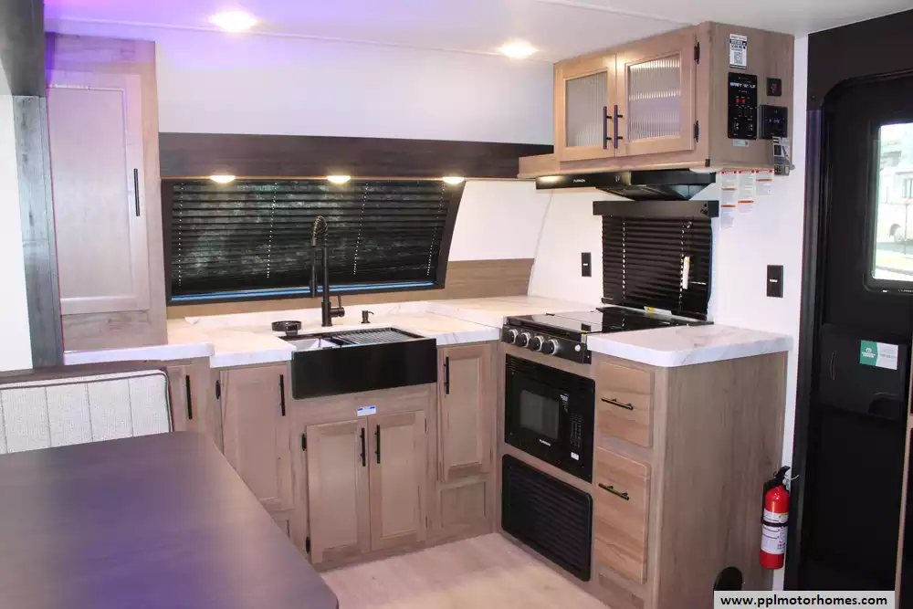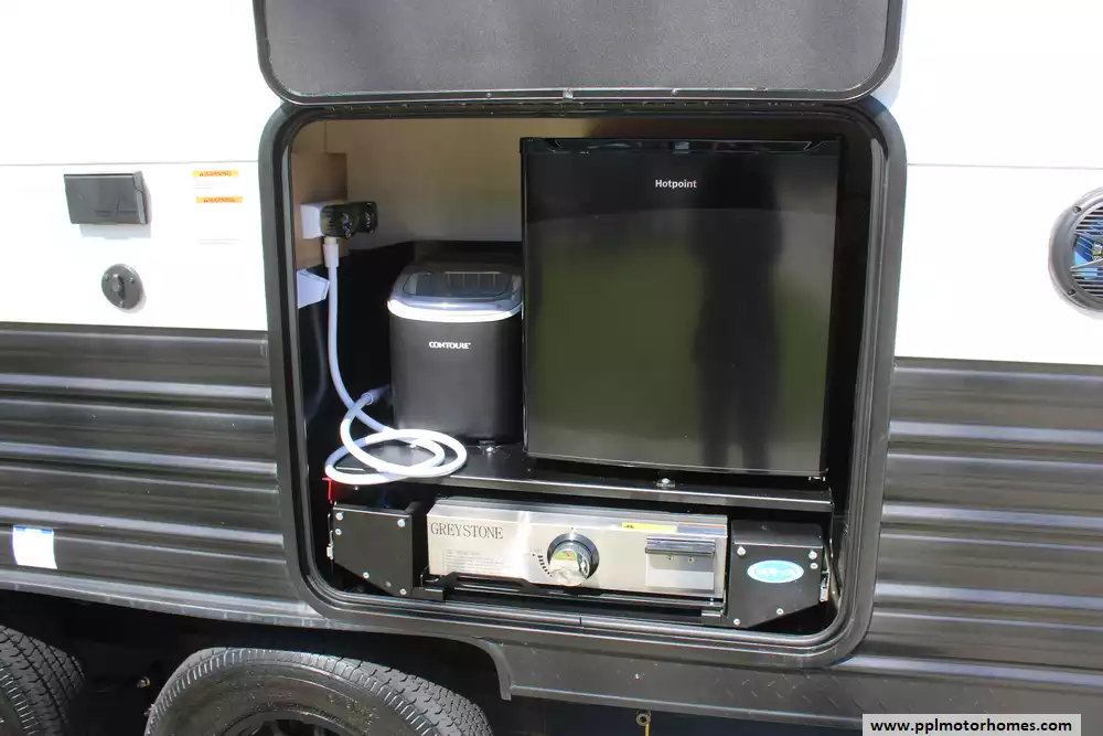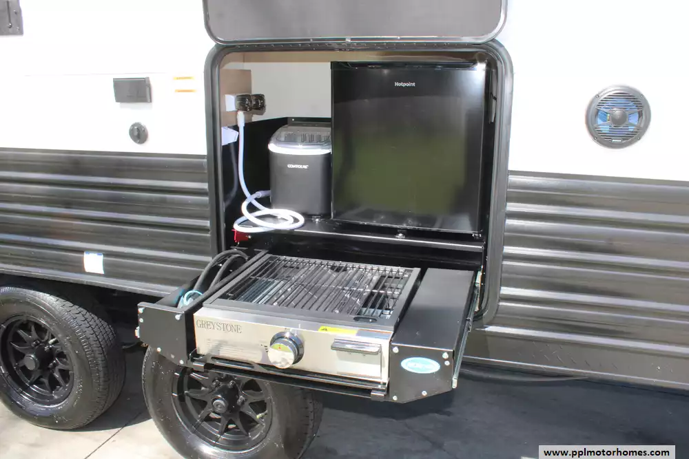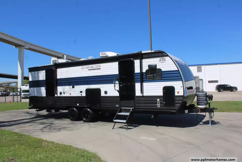 Setting up camp is effortless thanks to the electric tongue jack and an automatic main awning that creates an instant outdoor oasis. This Grey Wolf is fully prepared for off-grid or high-tech stays, featuring a factory-installed solar panel and a satellite dish for constant connectivity. The interior kitchen boasts a double door 12v refrigerator, microwave, and 3-burner range, while the outdoor kitchen and outside entertainment system allow you to take the party outdoors. With the added convenience of an outside shower and the reliability that has made Cherokee a top-selling name in the industry, the 27GH is the perfect choice for families and adventurers seeking a premium travel experience.