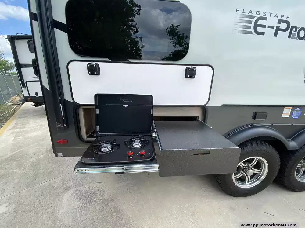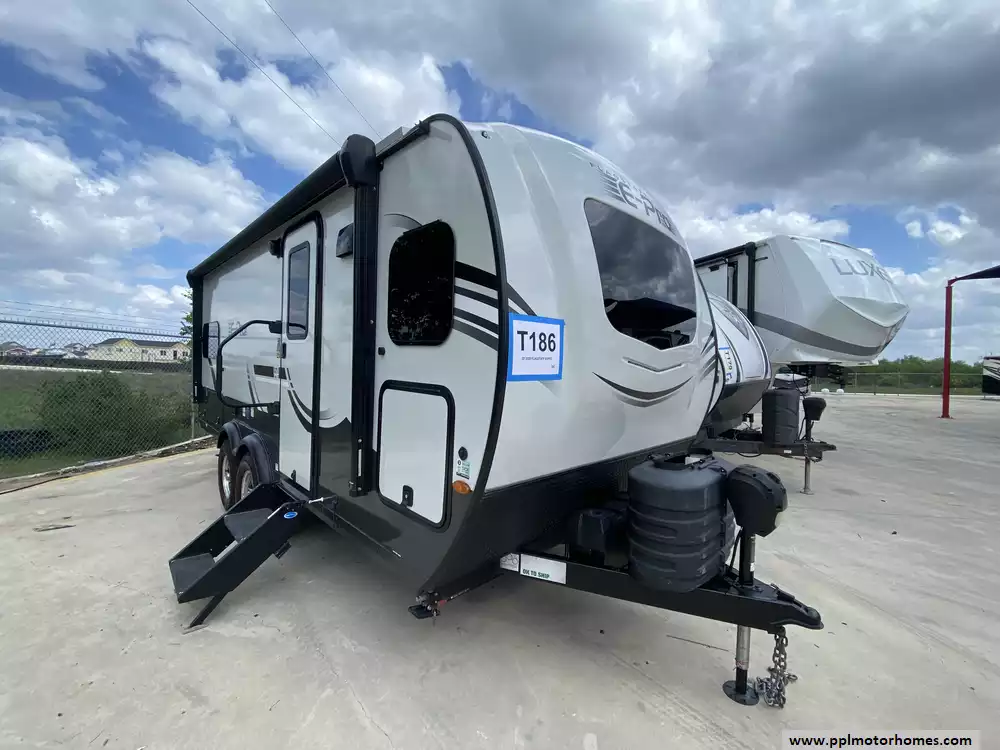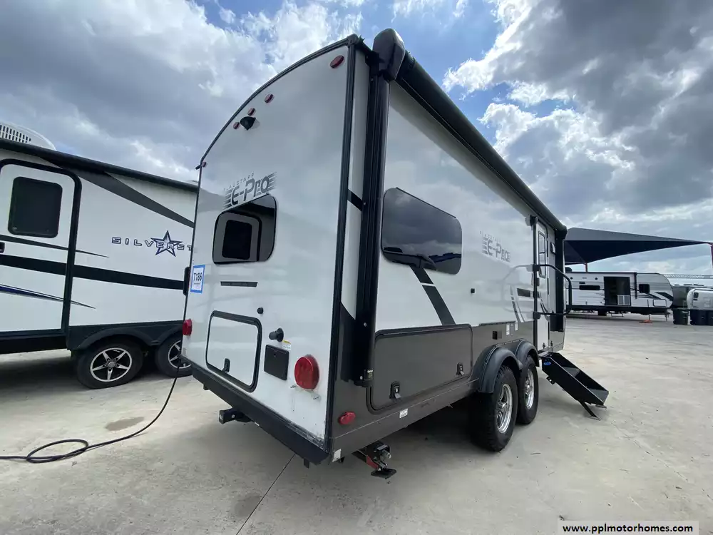 This adventure-ready travel trailer comes fully equipped for your next getaway, featuring a single slide-out that significantly opens up the interior living area. The chef-inspired kitchen includes a three-burner range, oven, microwave, and a double-door refrigerator, while the built-in TV and non-ducted air conditioner ensure your indoor time is always relaxing. Setting up camp is a breeze thanks to the electric tongue jack and automatic main awning. Additional outdoor conveniences include an outside shower and integrated outside speakers, allowing you to enjoy the full camping experience from the comfort of your patio. This E-Pro 20FK offers a sophisticated and functional retreat for those who refuse to compromise on quality.