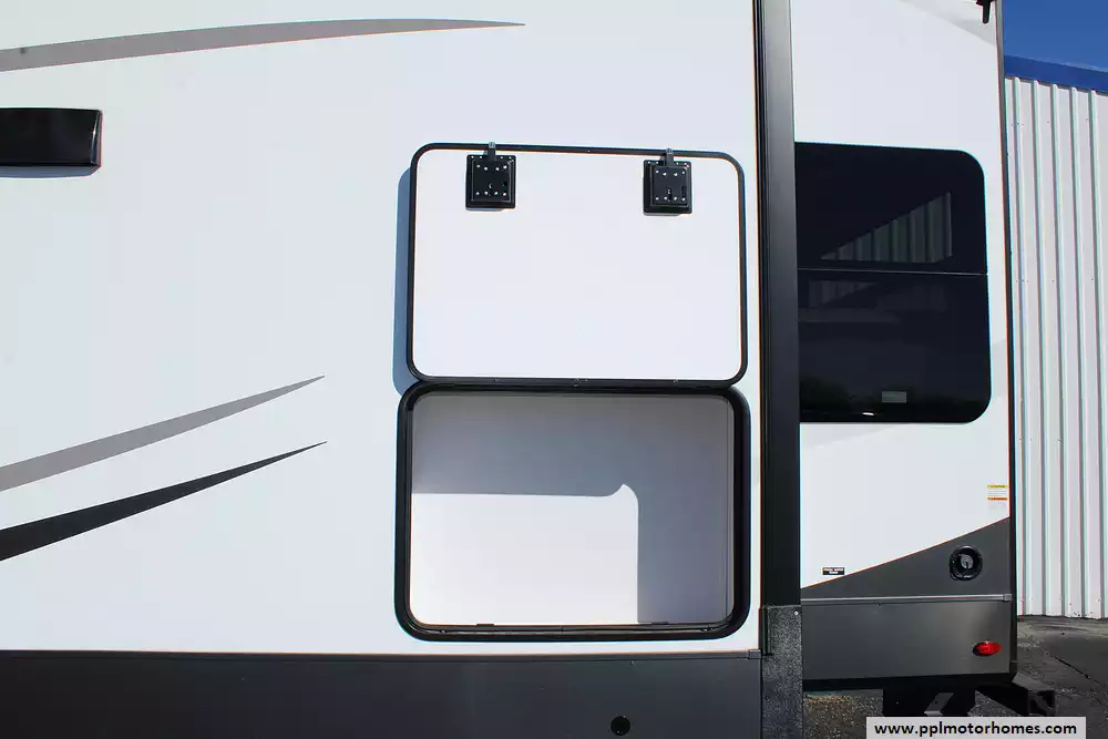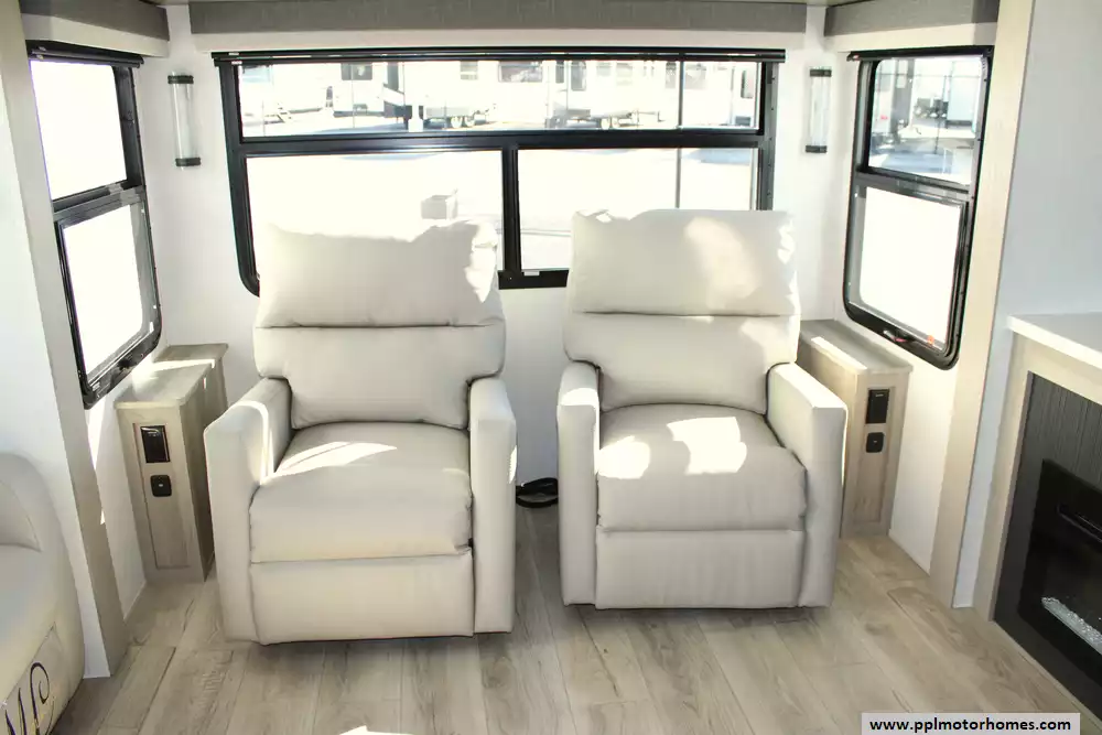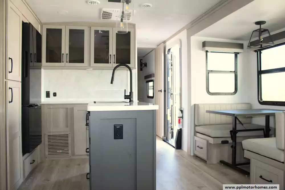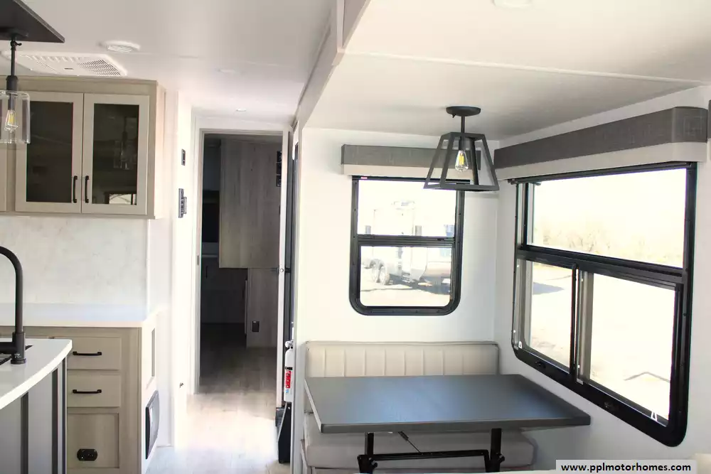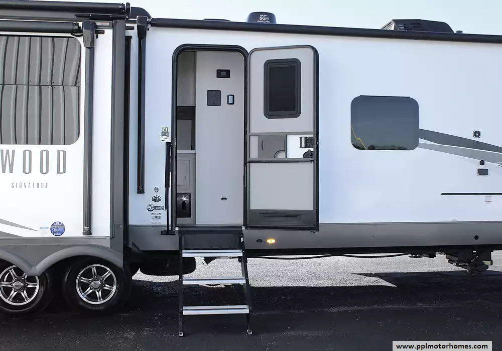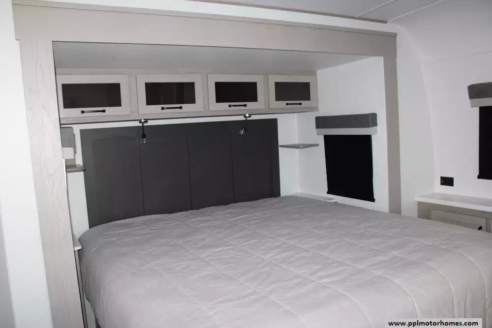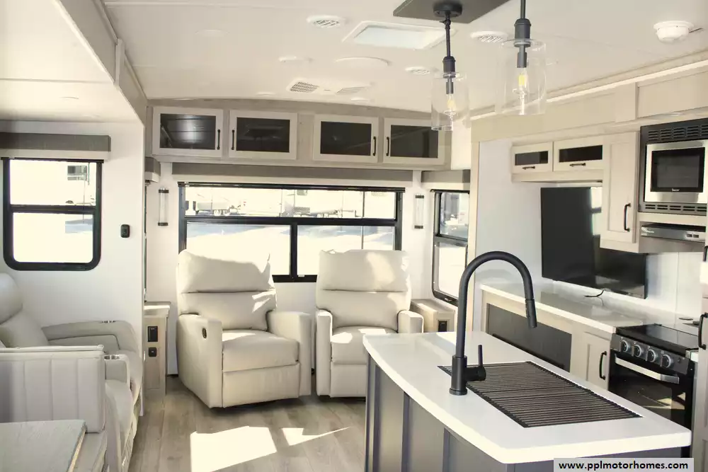 Inside, the 8337RL is designed to sleep up to five people comfortably, with a front bedroom that typically includes a king-size bed and flexible living area arrangements that accommodate additional guests. The generous residential kitchen, sizable living room, and dual awnings add to the sense of space and enjoyment whether you're staying at a campground or exploring off-the-grid destinations. Standard and available features reflect modern RVing expectations, including quality storage, stylish interior finishes, and integrated systems that make extended travel feel like home.