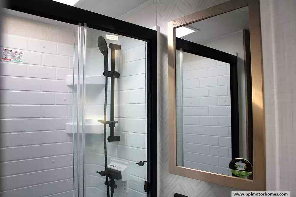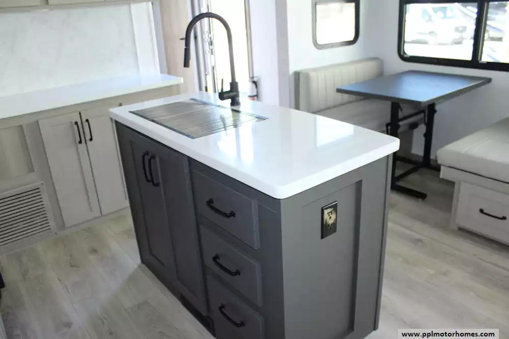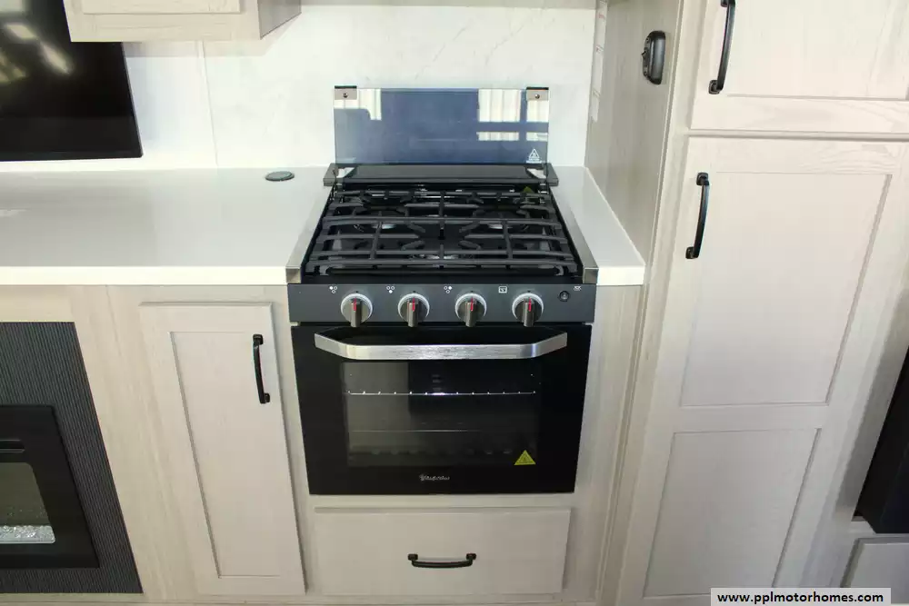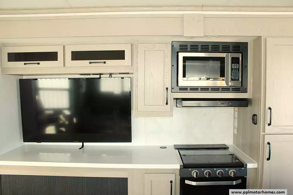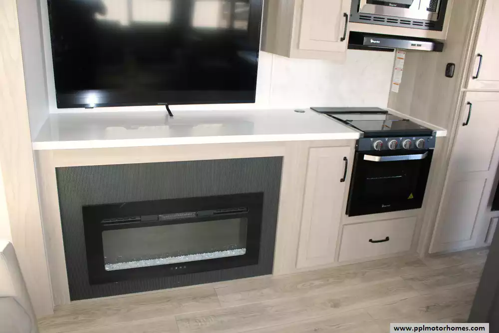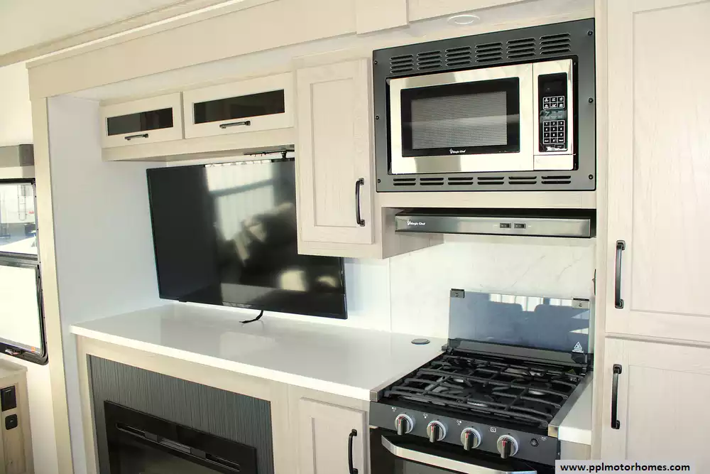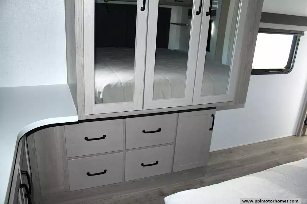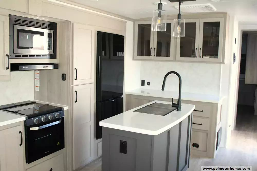 Inside, the 8337RL is designed to sleep up to five people comfortably, with a front bedroom that typically includes a king-size bed and flexible living area arrangements that accommodate additional guests. The generous residential kitchen, sizable living room, and dual awnings add to the sense of space and enjoyment whether you're staying at a campground or exploring off-the-grid destinations. Standard and available features reflect modern RVing expectations, including quality storage, stylish interior finishes, and integrated systems that make extended travel feel like home.