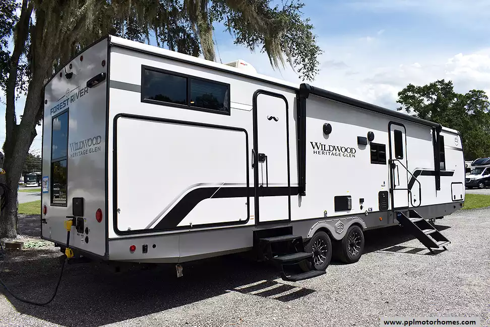 This 2025 Wildwood Heritage Glen 314BUD has an Electric Tongue Jack, 2 Slide-outs, 2 Ducted Air Conditioners, Double Door 12v Furrion Refrigerator (Additional Refrigerator Present), Automatic Main Awning And Window/Slide Awnings, Solar Panel, Heated Tanks, Outside Speakers, TV, Outdoor Grill, Outdoor Kitchen, Outside Shower, Fireplace, Central Vacuum, Convection Microwave, 3 Burner Range, Oven