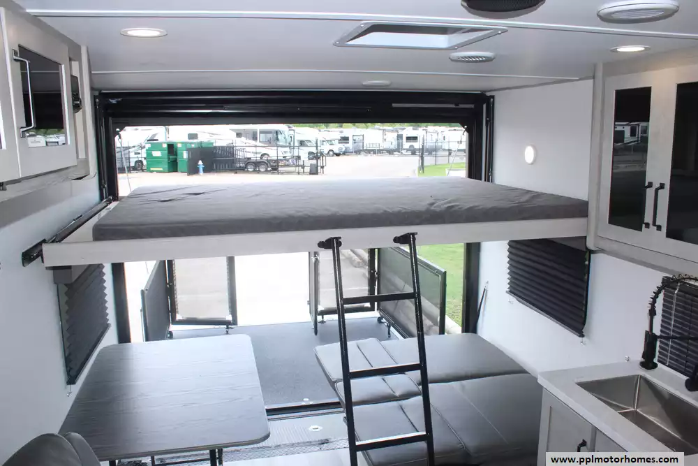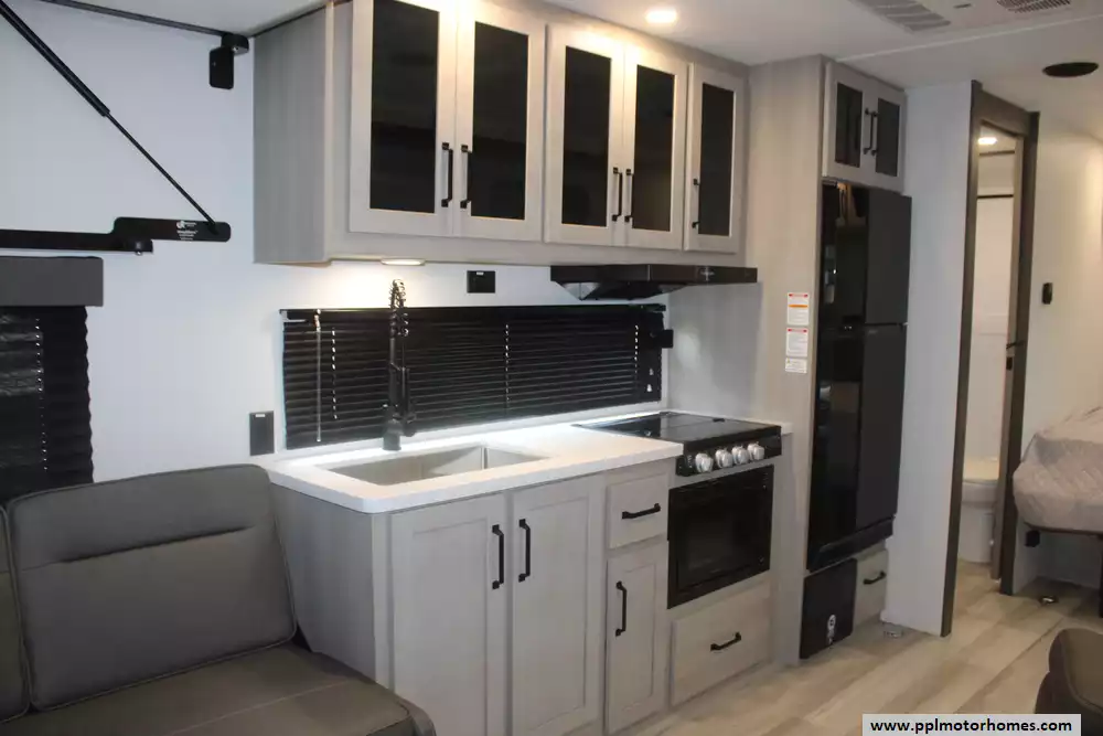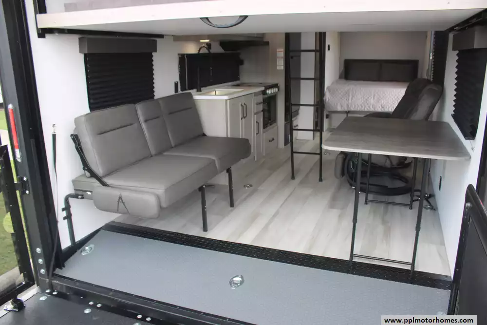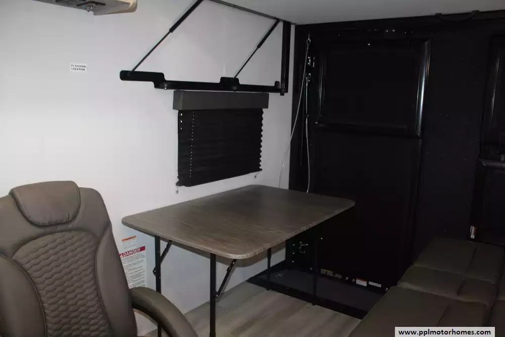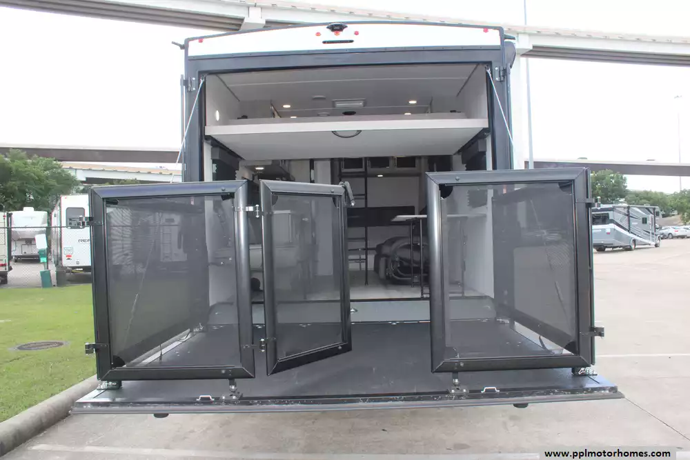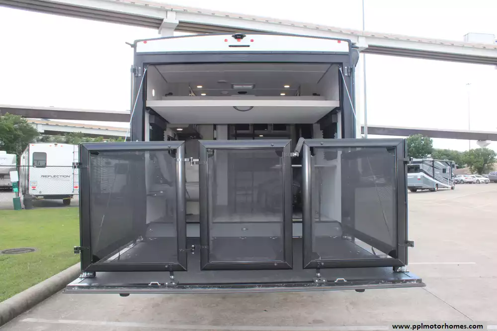 The interior is thoughtfully equipped to keep you comfortable between excursions, featuring a full kitchen with a three-burner range, microwave, and a large double door 12v Furrion refrigerator. Stay cool in any climate with the ducted air conditioner, and enjoy your downtime with two built-in TVs and an integrated sound system with outside speakers. Setup is quick and effortless thanks to the electric tongue jack and an automatic main awning that provides instant shade and outdoor living space. Whether you are hauling ATVs or simply enjoying the great outdoors, this Momentum 22MAV offers the premium features and legendary Grand Design quality you need for a seamless travel experience.
