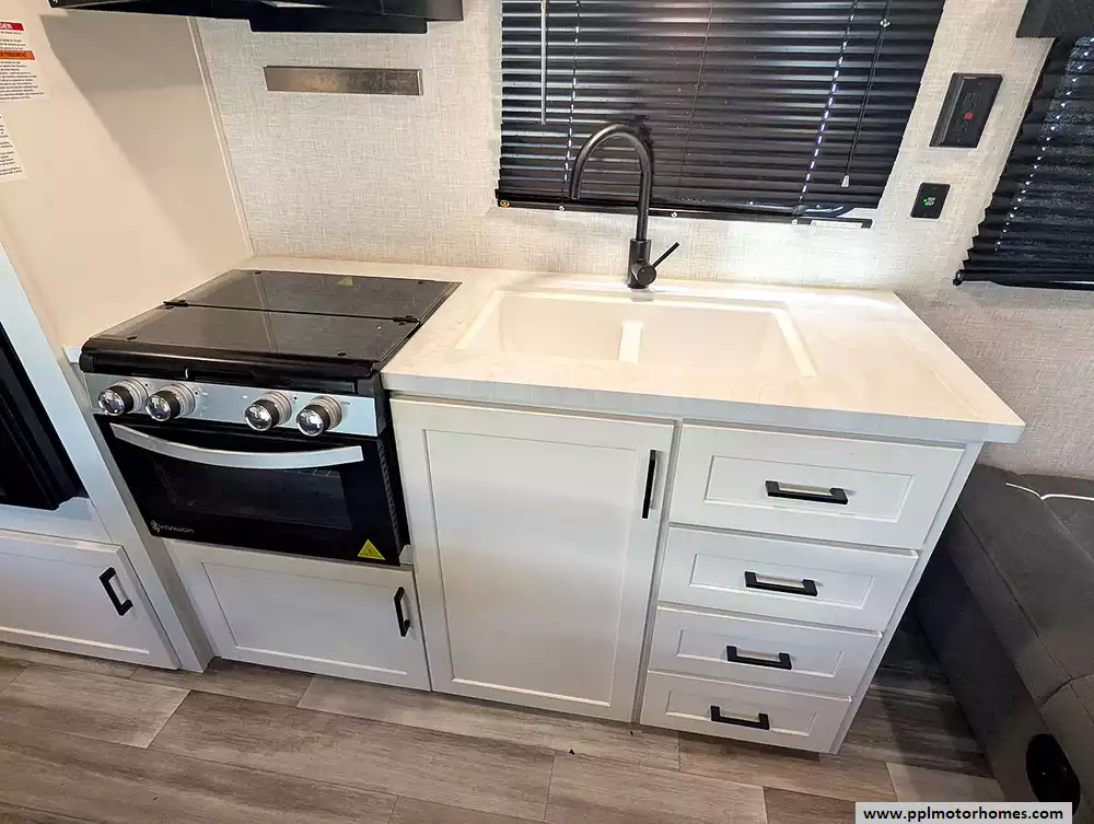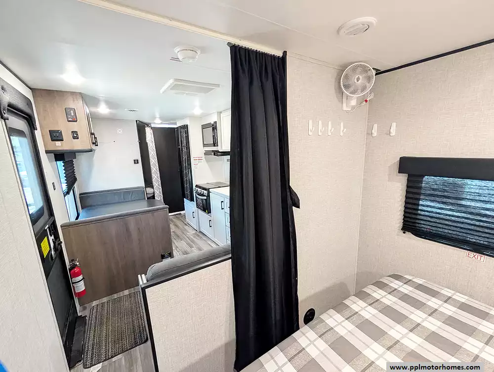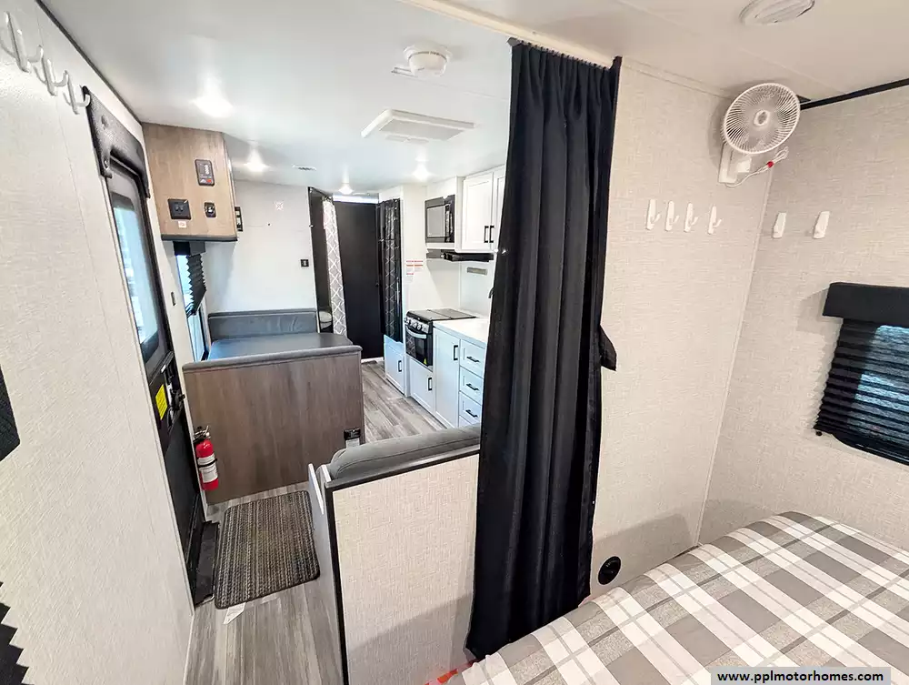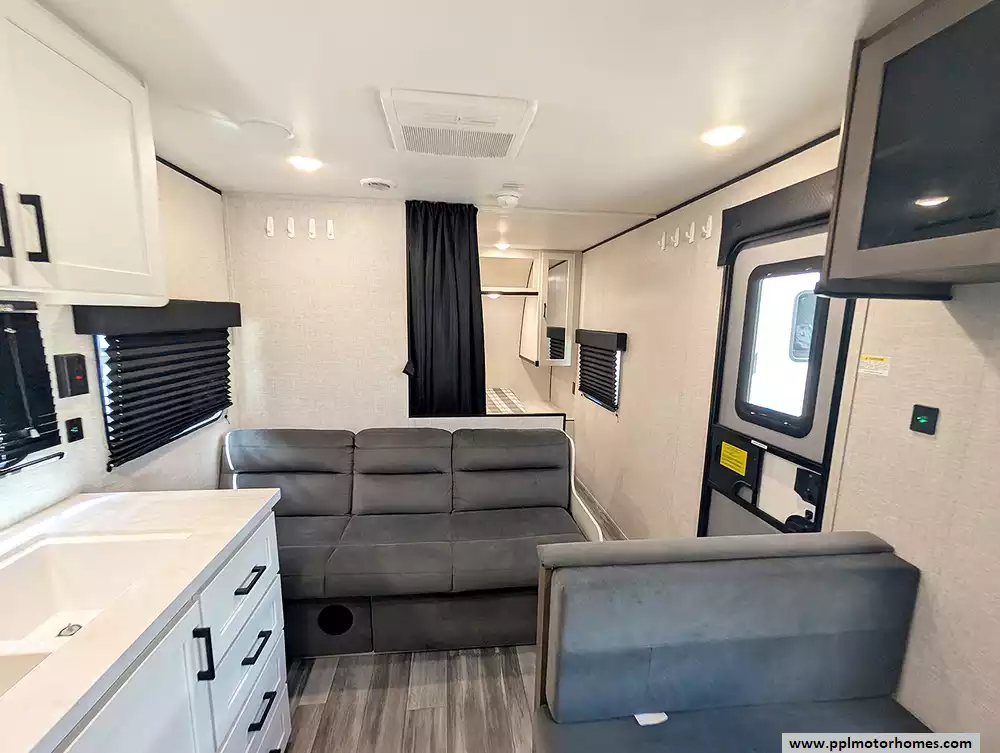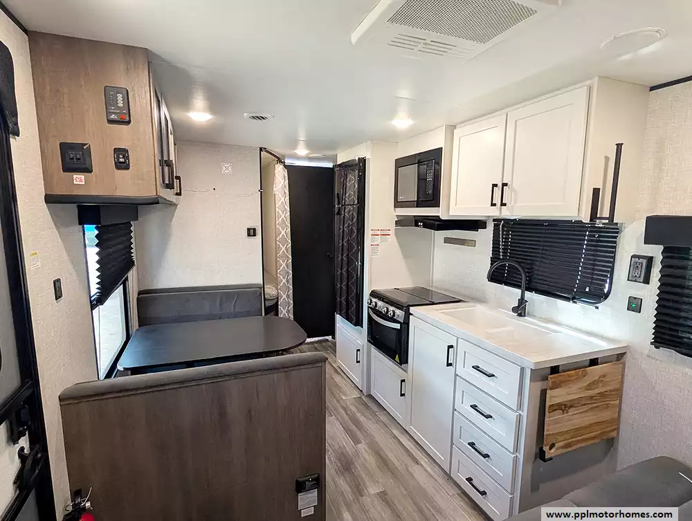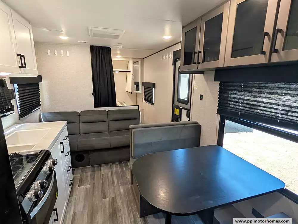 At around 29.5 feet long and about 4,700 lbs dry weight, it's towable by many half-ton trucks and SUVs, and includes features like a power awning, large fresh water capacity, and practical storage throughout