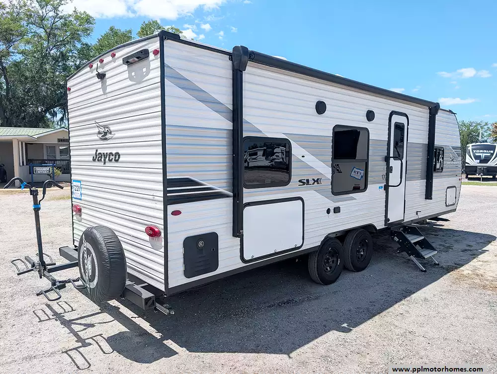 The 2025 Jayco Jay Flight SLX 260BH is a lightweight travel trailer that sleeps up to 8 people, featuring a front queen bed, rear queen size bed, and additional sleeping space from the dinette and sofa. It has a simple no-slide layout with a full kitchen and bathroom, making it a practical family camper.