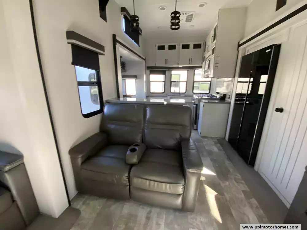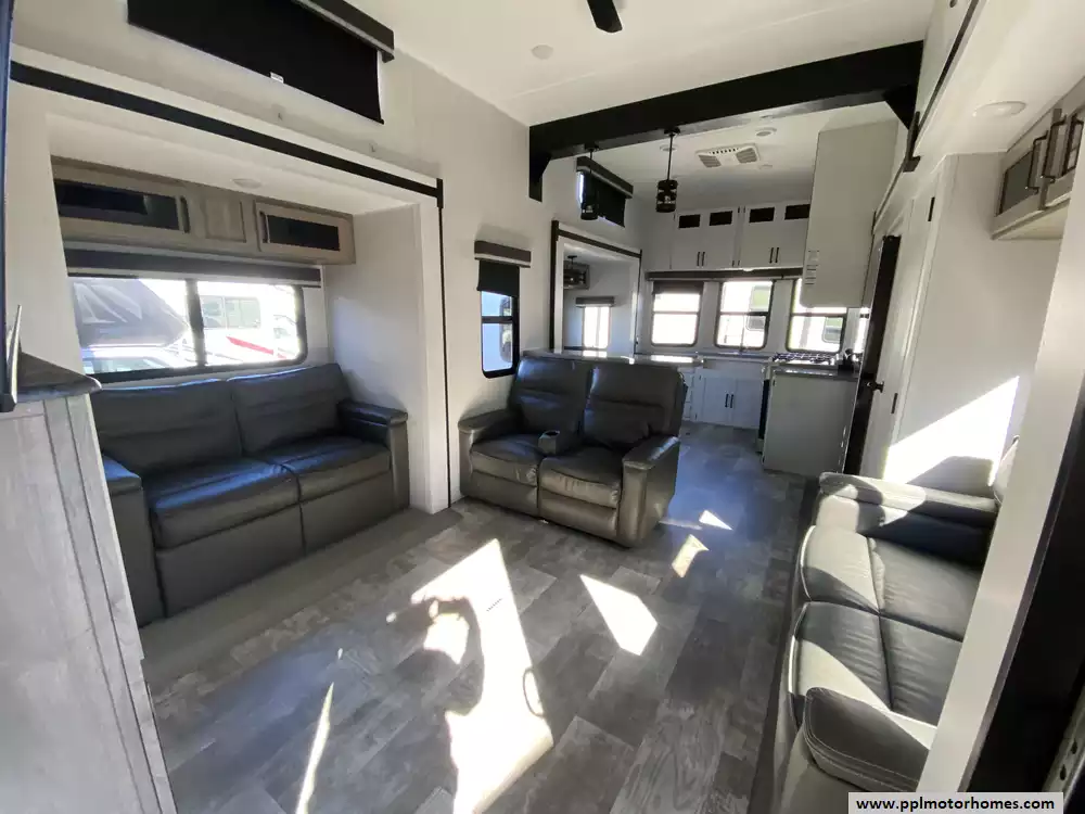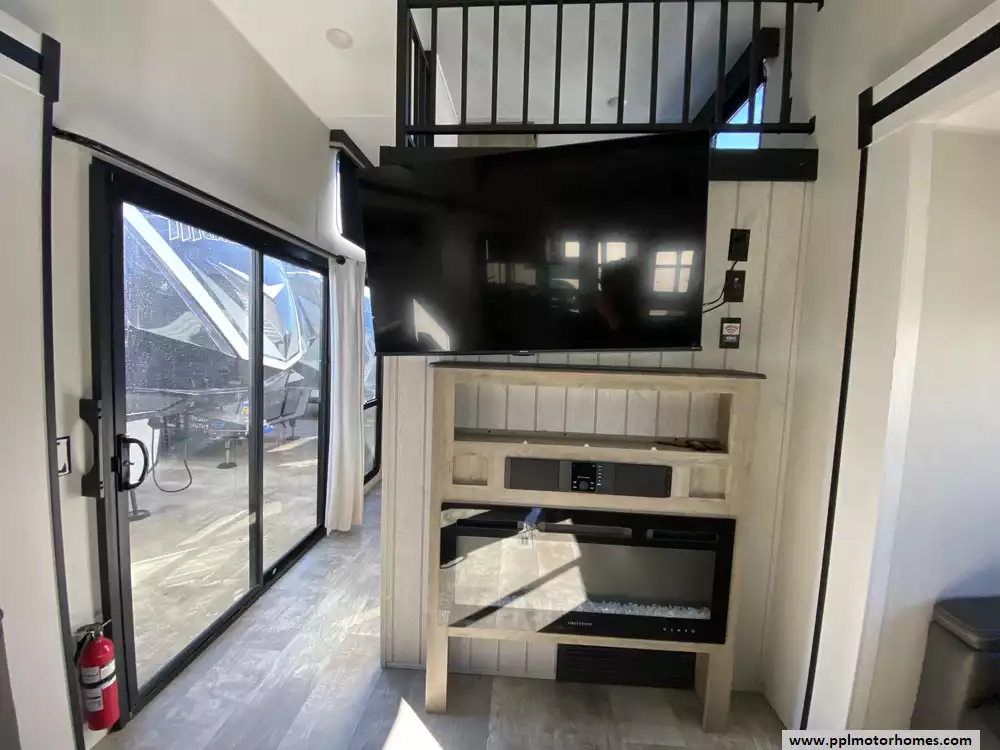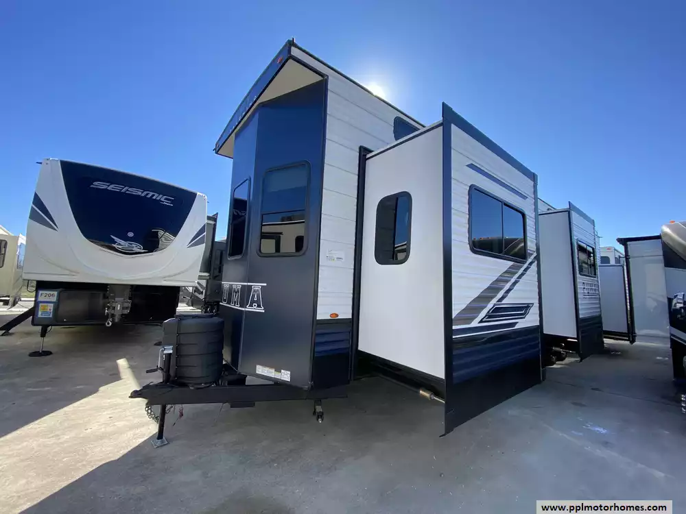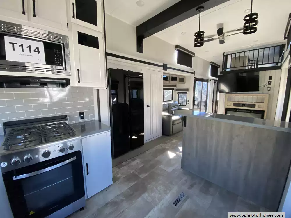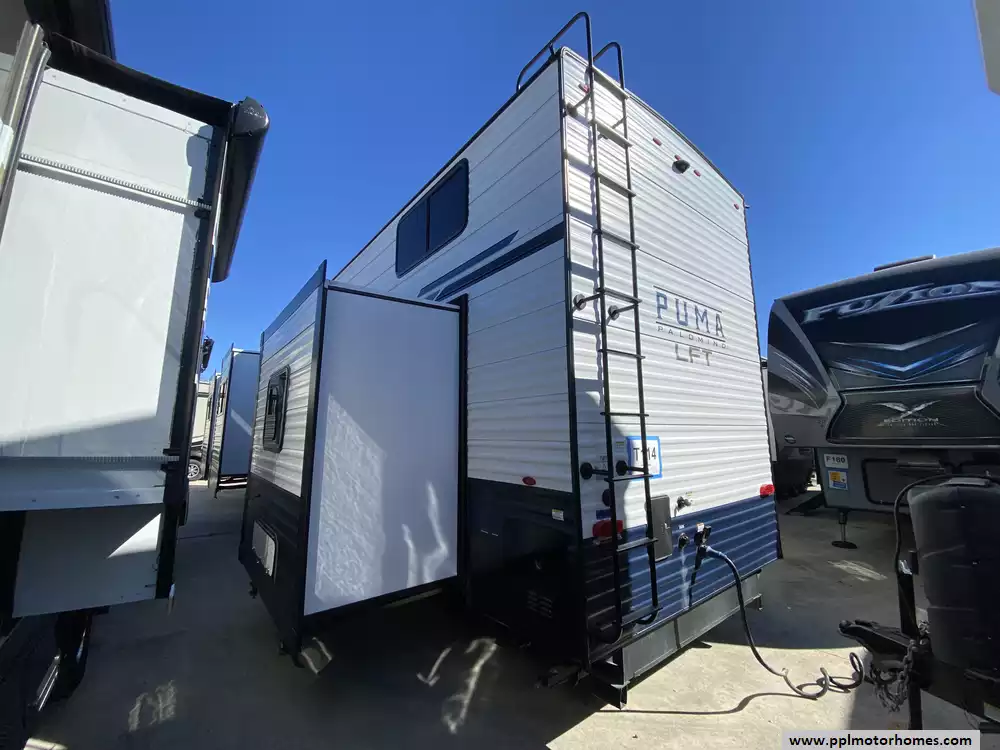 This 2025 Puma 403LFT has a 4 Slide-outs, 2 Ducted Air Conditioners, Double Door Refrigerator, Automatic Main Awning, Washer/Dryer Connections, Outside Speakers, TV, Outside Shower, Fireplace, Microwave, 4 Burner Range, Oven