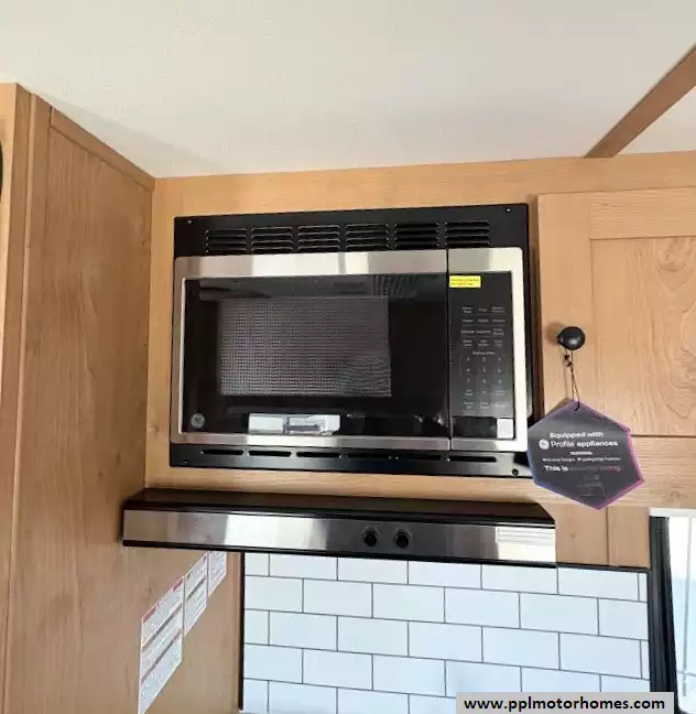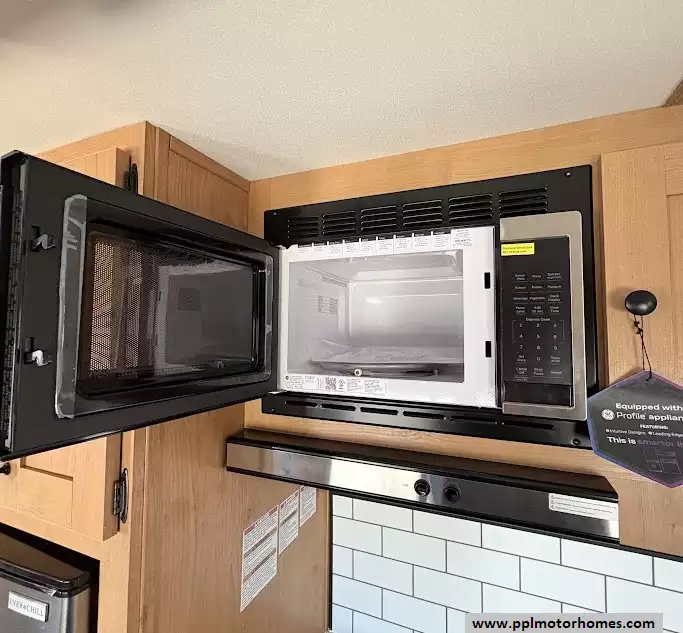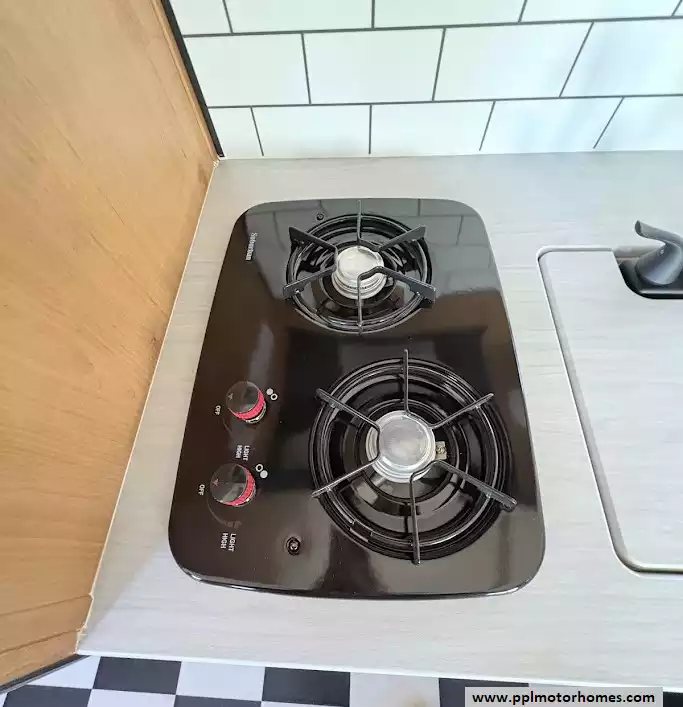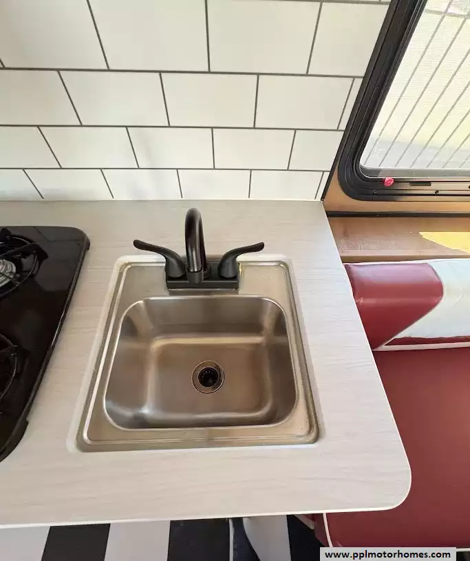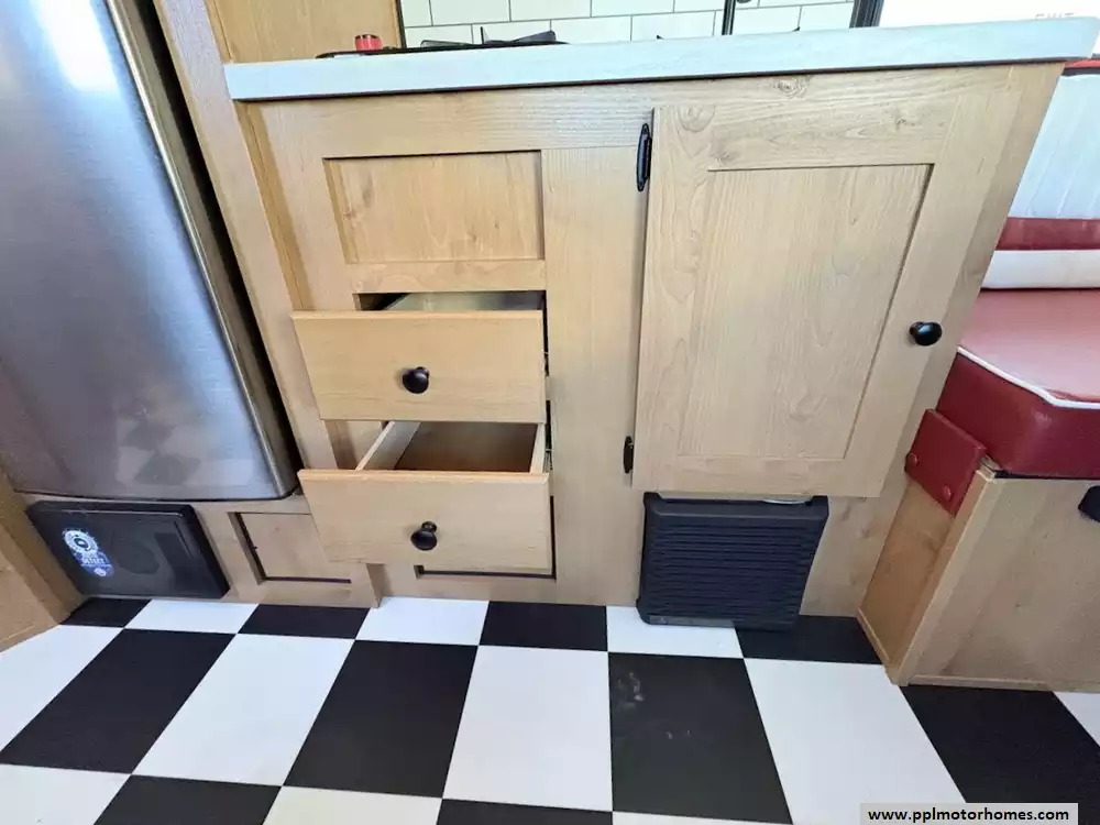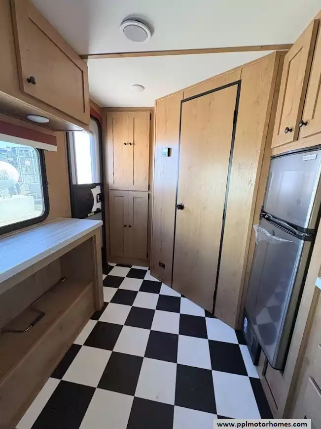 Positioned along the center wall, the kitchen includes a two-burner stove, a square stainless-steel sink, a microwave, and a 2-door refrigerator/freezer. Opposite the kitchen is a versatile cabinet block that can be used as extra counter space, a "window-side bar," or a desk. There are also hanging wardrobes or shoe cabinets located immediately next to the entry door.