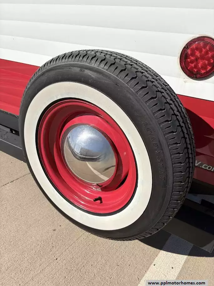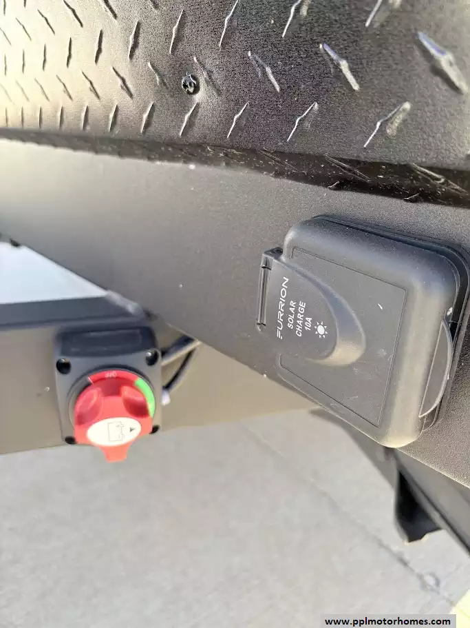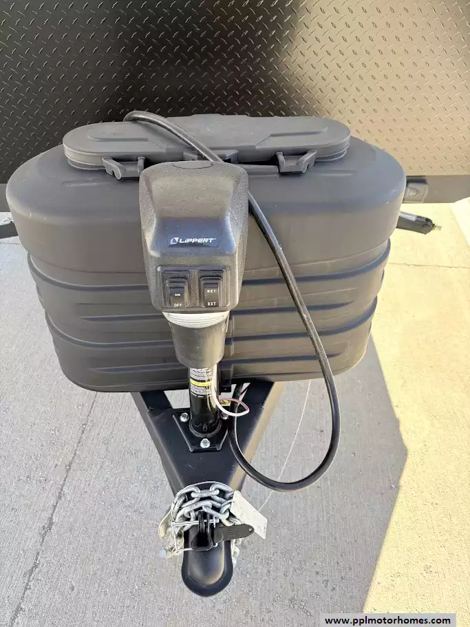 Outside you will find a power awning is standard, providing shade and an integrated LED light strip for ambiance and practical lighting in the evenings. The trailer includes exterior speakers, linked to the AM/FM/Bluetooth stereo, for enjoying music outdoors. A standard outdoor shower provides a convenient way to rinse off after a day of outdoor activities or to clean gear.