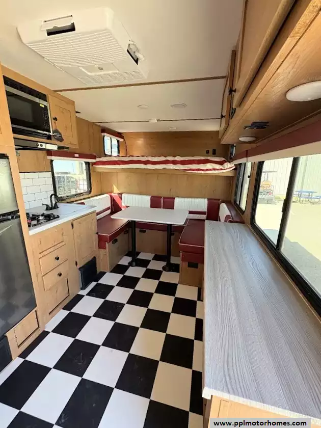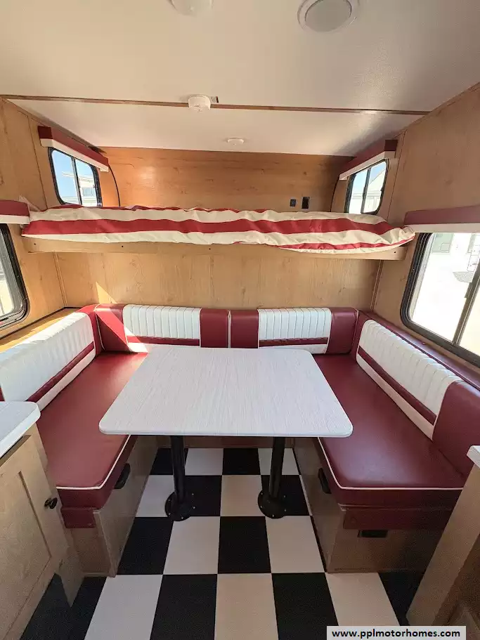 The primary bed is a fixed bunk located at the very front, protruding over the trailer's tongue. While it maximizes space, the ceiling height in this area is low, making it ideal for children or agile adults. Located directly beneath and behind the cabover bunk is a U-shaped dinette. This area serves as the primary seating for dining and converts into a second sleeping space for two people.