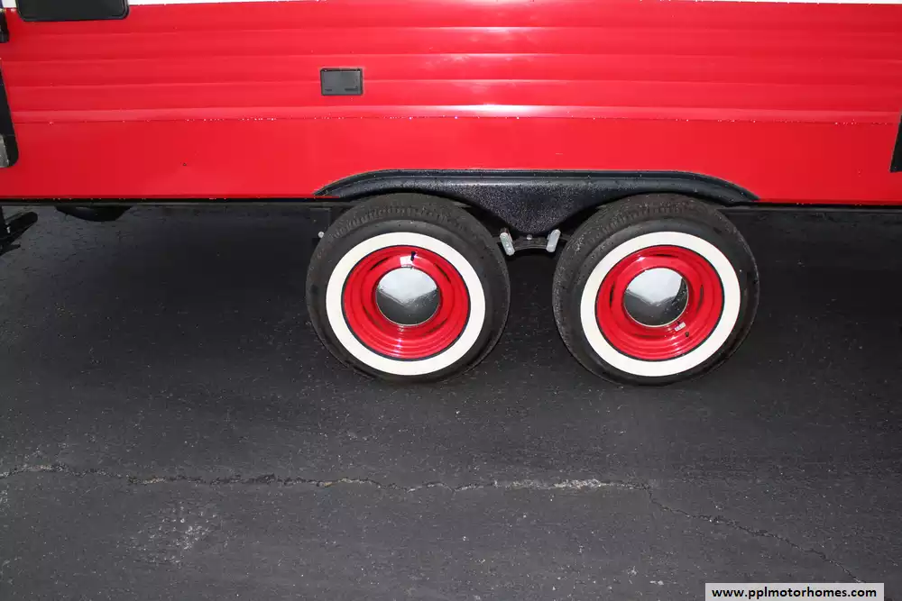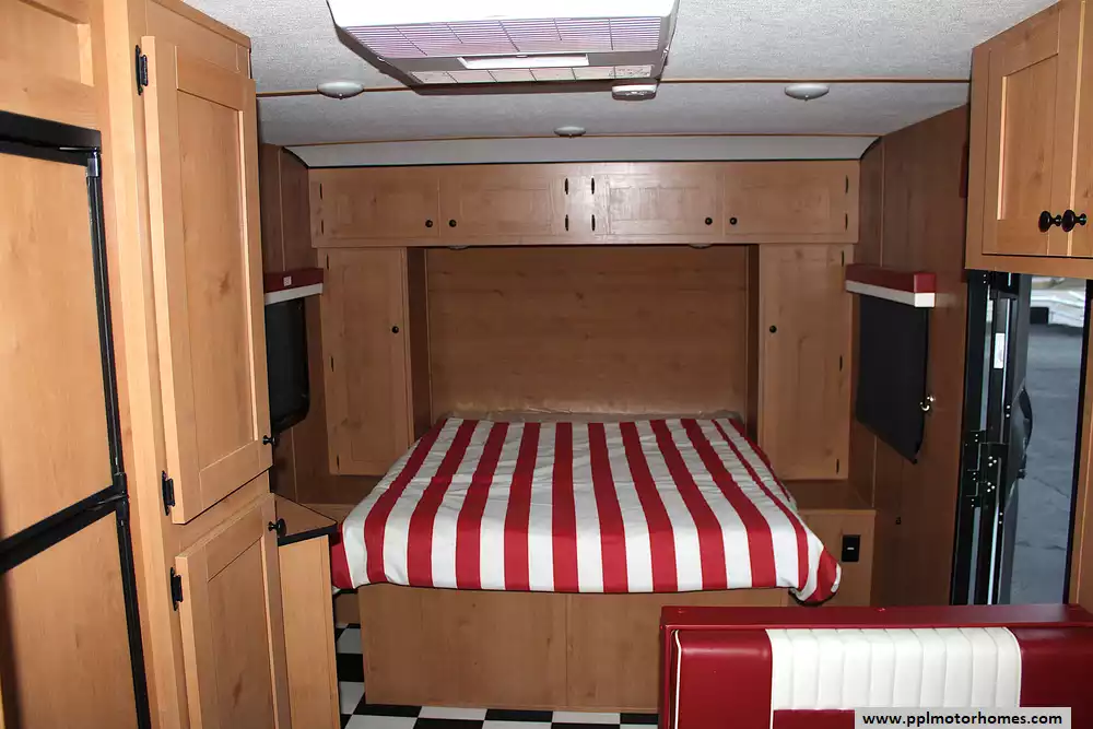 A travel trailer that effortlessly combines nostalgic design with modern convenience. The Retro's distinctive exterior finish and vintage-inspired accents catch the eye from any angle, giving you that warm, classic-on-the-road vibe. Inside, you'll find a cozy front RV queen bed, a generously sized booth dinette for meals or gaming, and a rear-corner bathroom with a radius shower to keep you refreshed after a day of adventure.