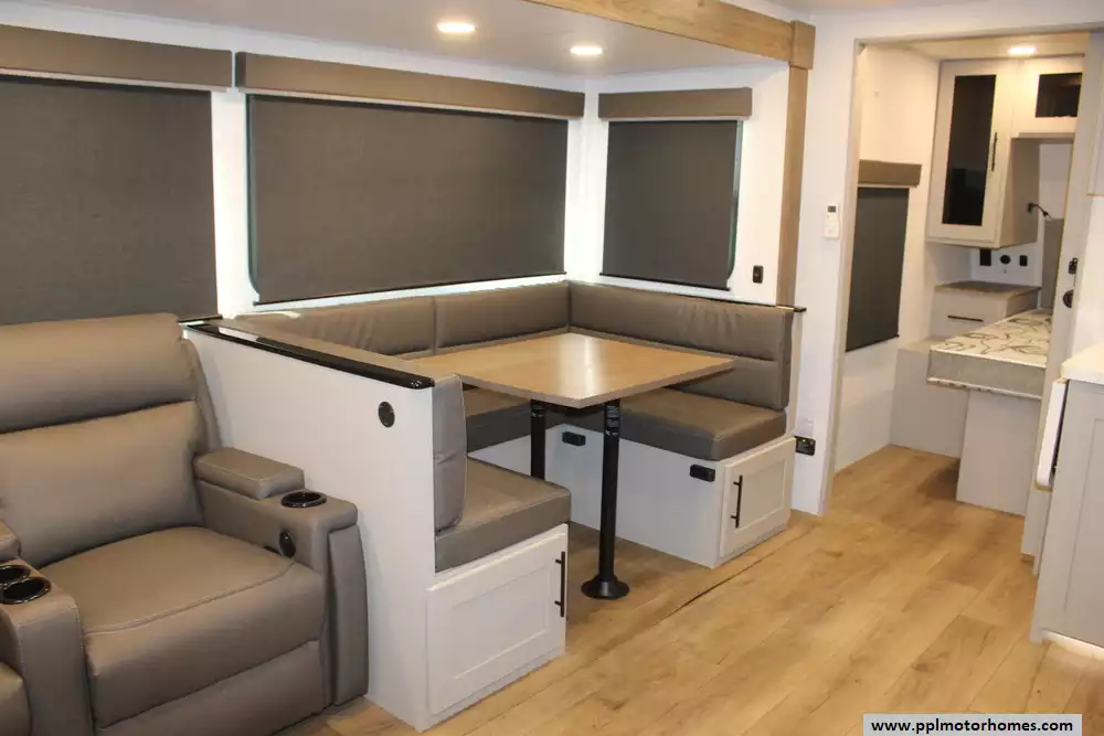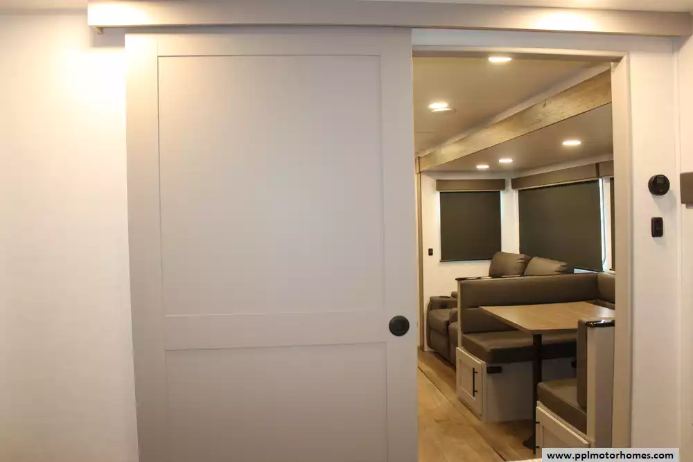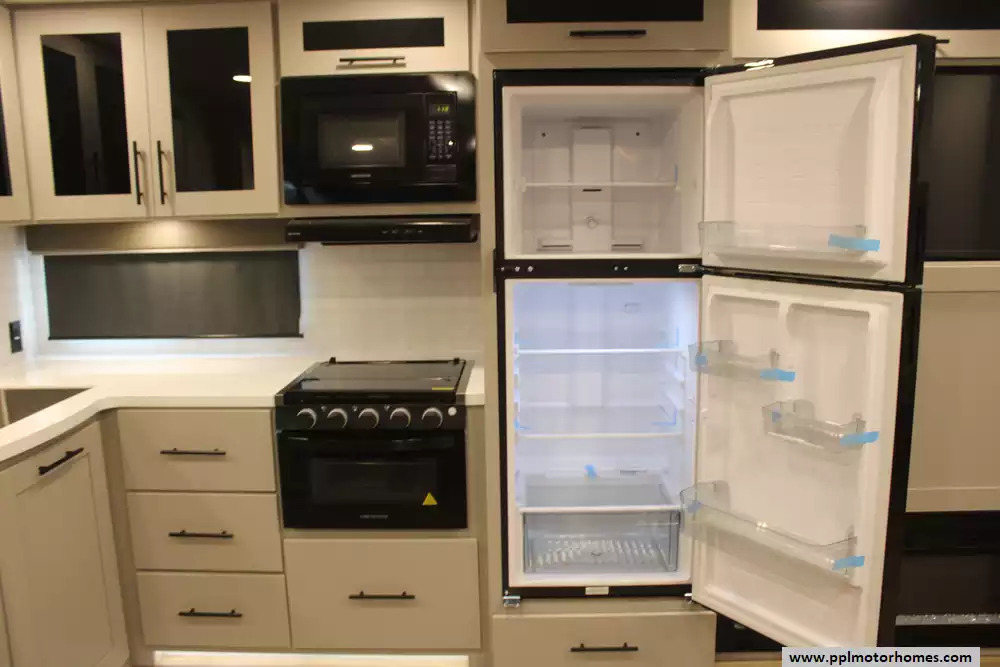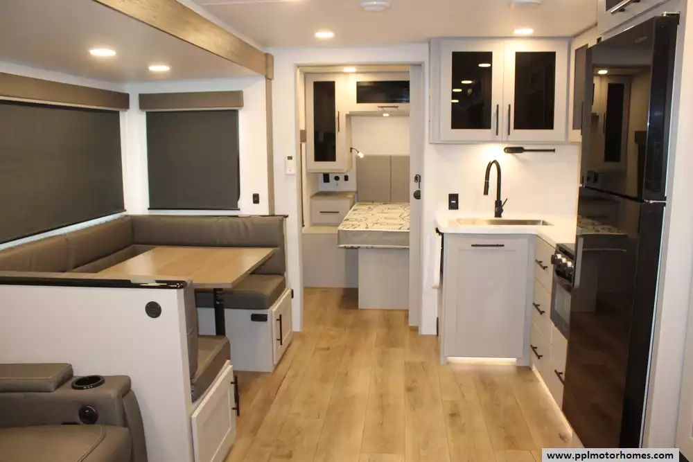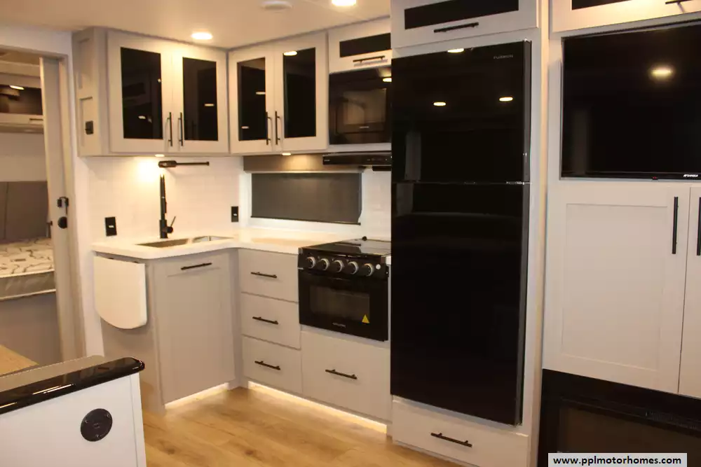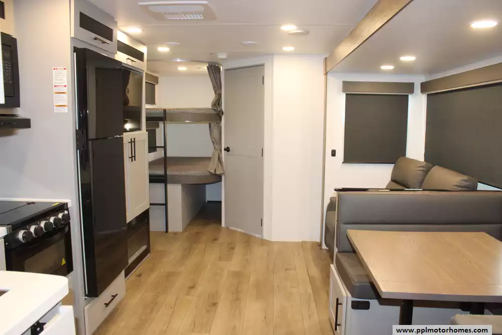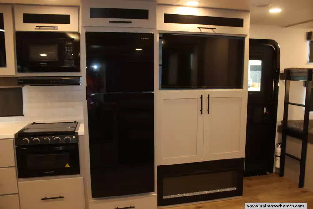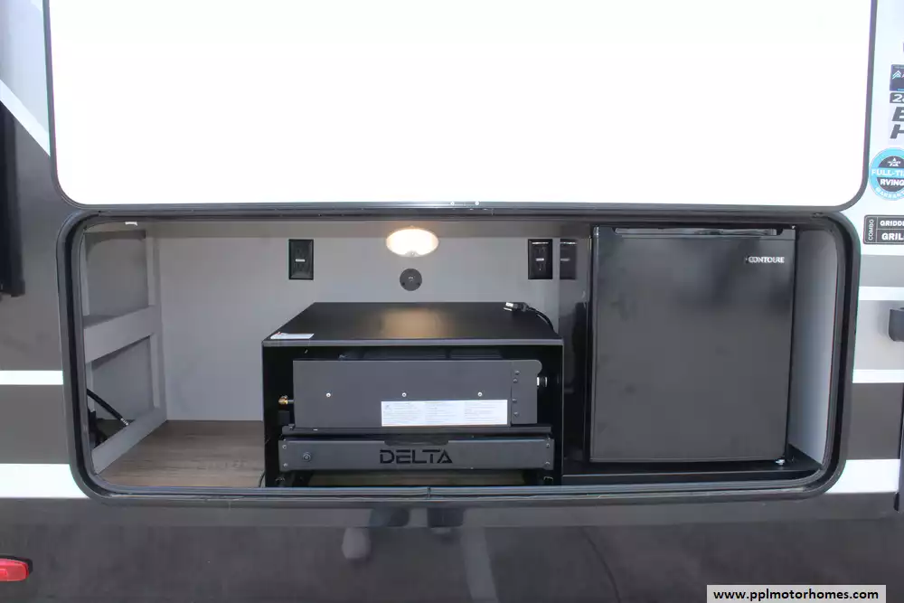 The interior of the Delta 281BH is a showcase of modern convenience and high-end finishes. You will feel right at home in the well-appointed kitchen, which boasts a double-door 12v Furrion refrigerator, microwave, oven, and a three-burner range for effortless meal prep. The living area invites you to unwind by the warm glow of the fireplace while enjoying the included TV, or you can take the cooking outdoors to the fully equipped exterior kitchen. With its reputation for superior storage and thoughtful bunkhouse floorplans, this 2026 Delta is the ultimate retreat for families who demand both style and substance on the open road.